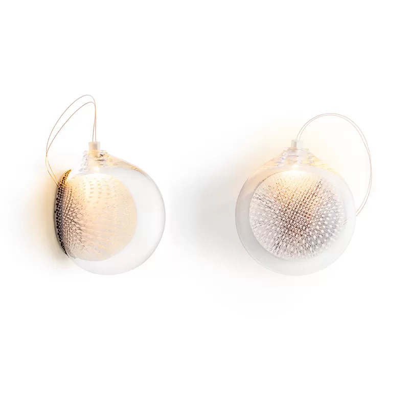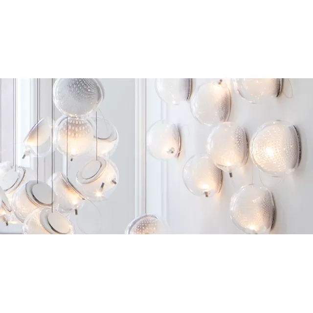A vacuum is introduced to a strata composed of hot white and clear glass with copper mesh between; the vacuum causes the white layer to pull away through the embedded mesh, leaving numerous tendrils of white glass suspended within an interstitial space as it goes.