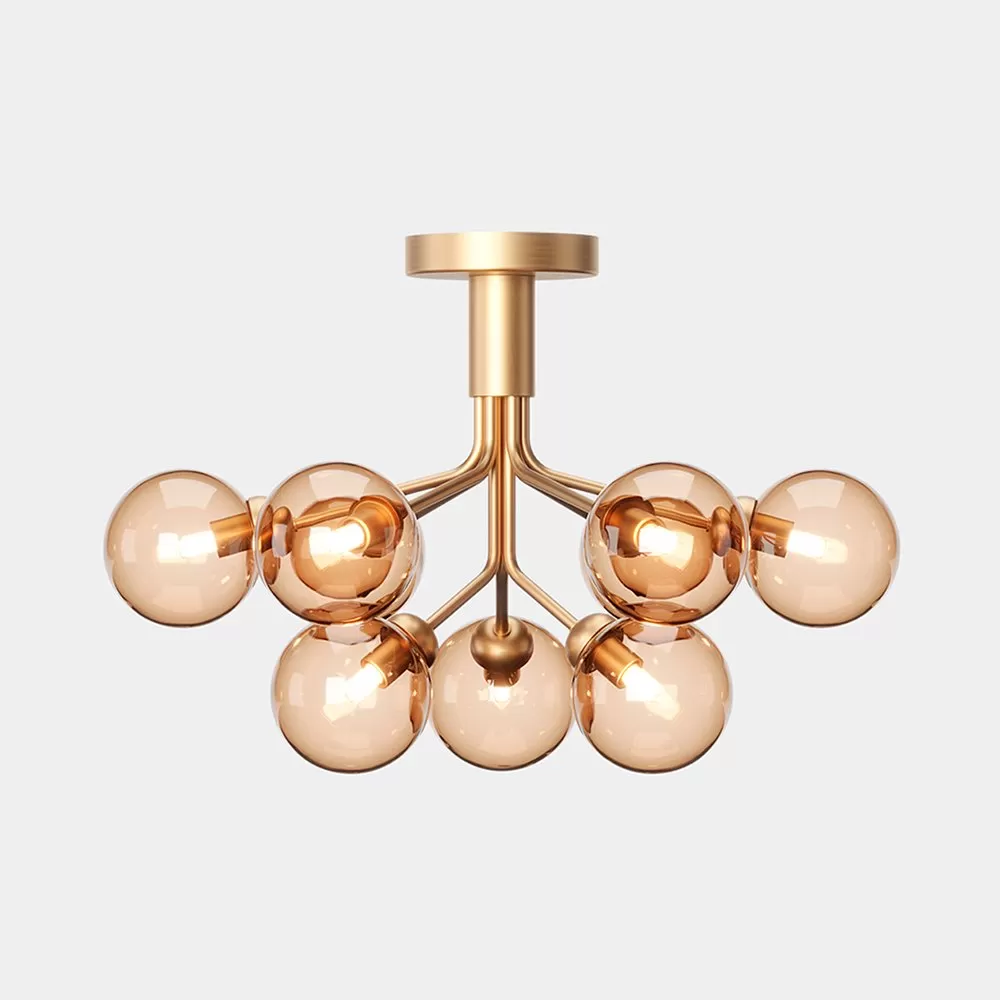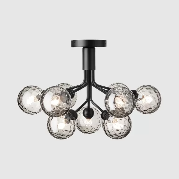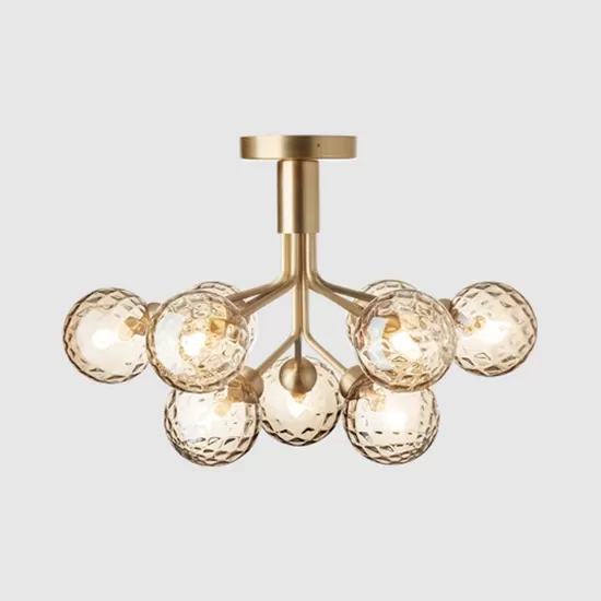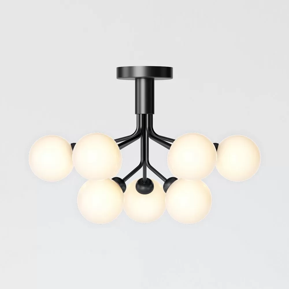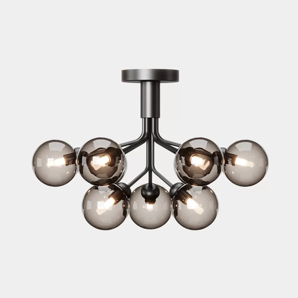 With inspiration from flowers, Sofie Refer has designed the chandelier collection, Apiales. The collection consists of chandeliers with 9 or 18 mouth-blown glass globes. A ceiling mounted version with 9 globes is also available. From a specially-produced canopy, the arms unfold like flower stalks from which light is spread with grace. Suitable for residential homes, restaurants and hotels. Apiales 9 Ceiling can be mounted directly onto the ceiling and has a low height of just 40 cm. This gives great flexibility in its application and makes it ideal for rooms with lower ceilings or in intermediate spaces.