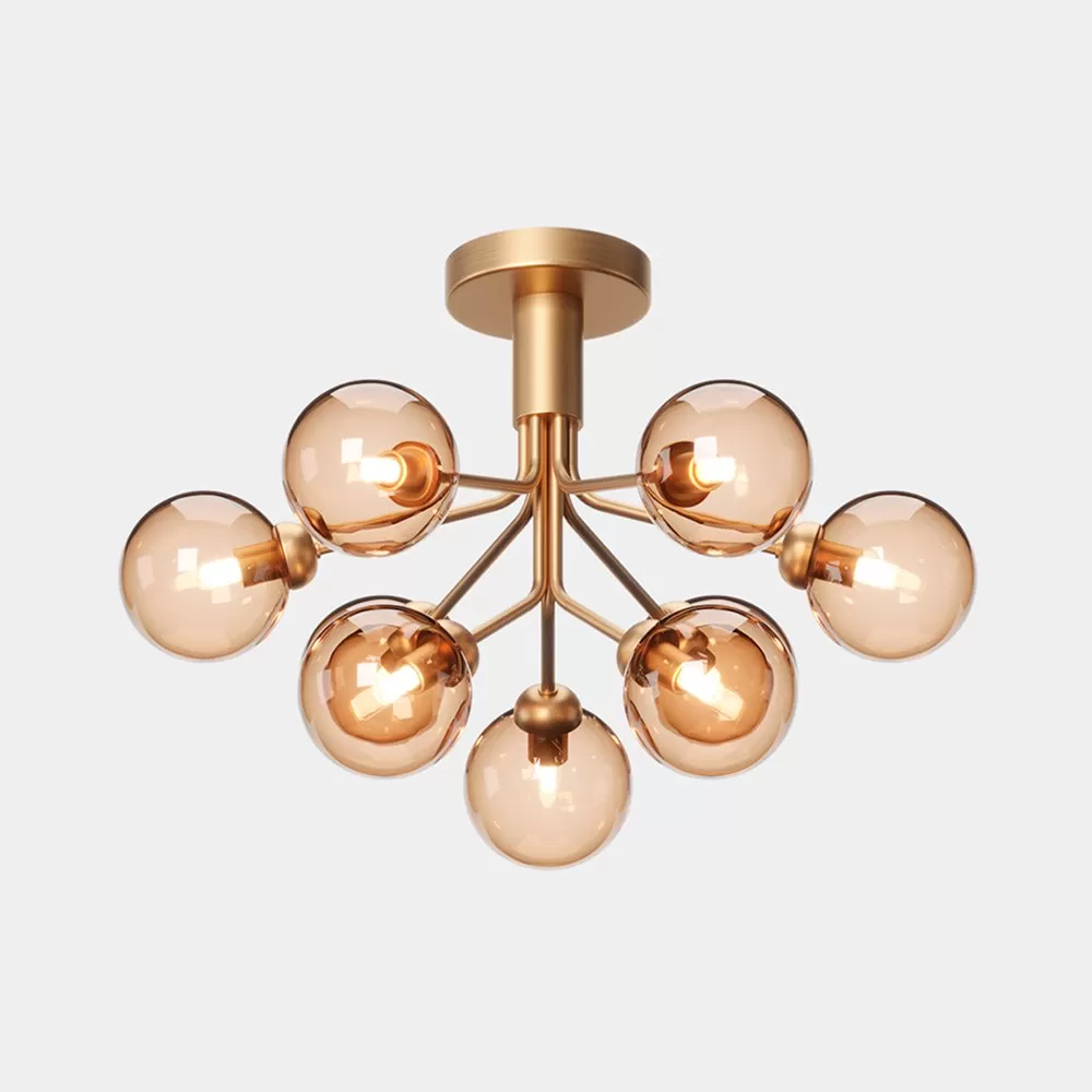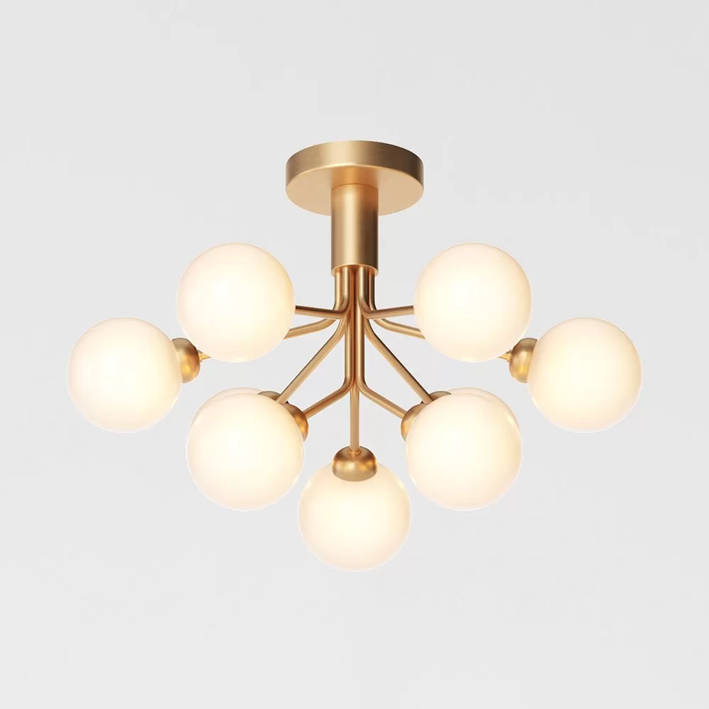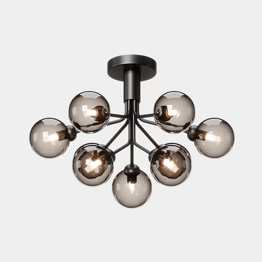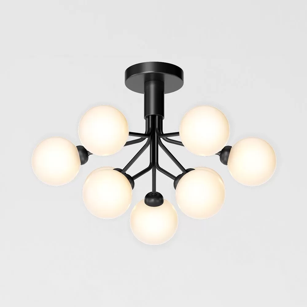 With inspiration from flowers, Sofie Refer has designed the chandelier collection, Apiales. The collection consists of chandeliers with 9 or 18 mouth-blown glass globes. A ceiling mounted version with 9 globes is also available. From a specially-produced canopy, the arms unfold like flower stalks from which light is spread with grace. Suitable for residential homes, restaurants and hotels. Apiales 9 Ceiling can be mounted directly onto the ceiling and has a low height of just 40 cm. This gives great flexibility in its application and makes it ideal for rooms with lower ceilings or in intermediate spaces.