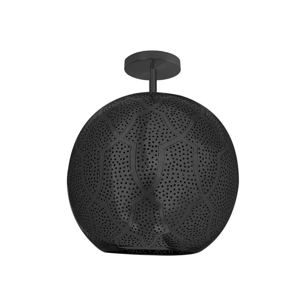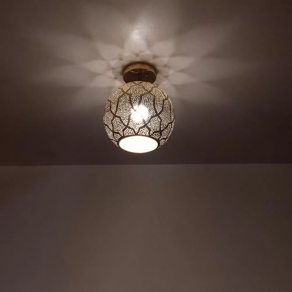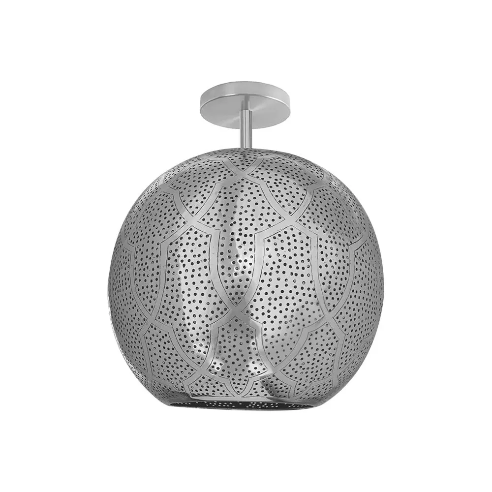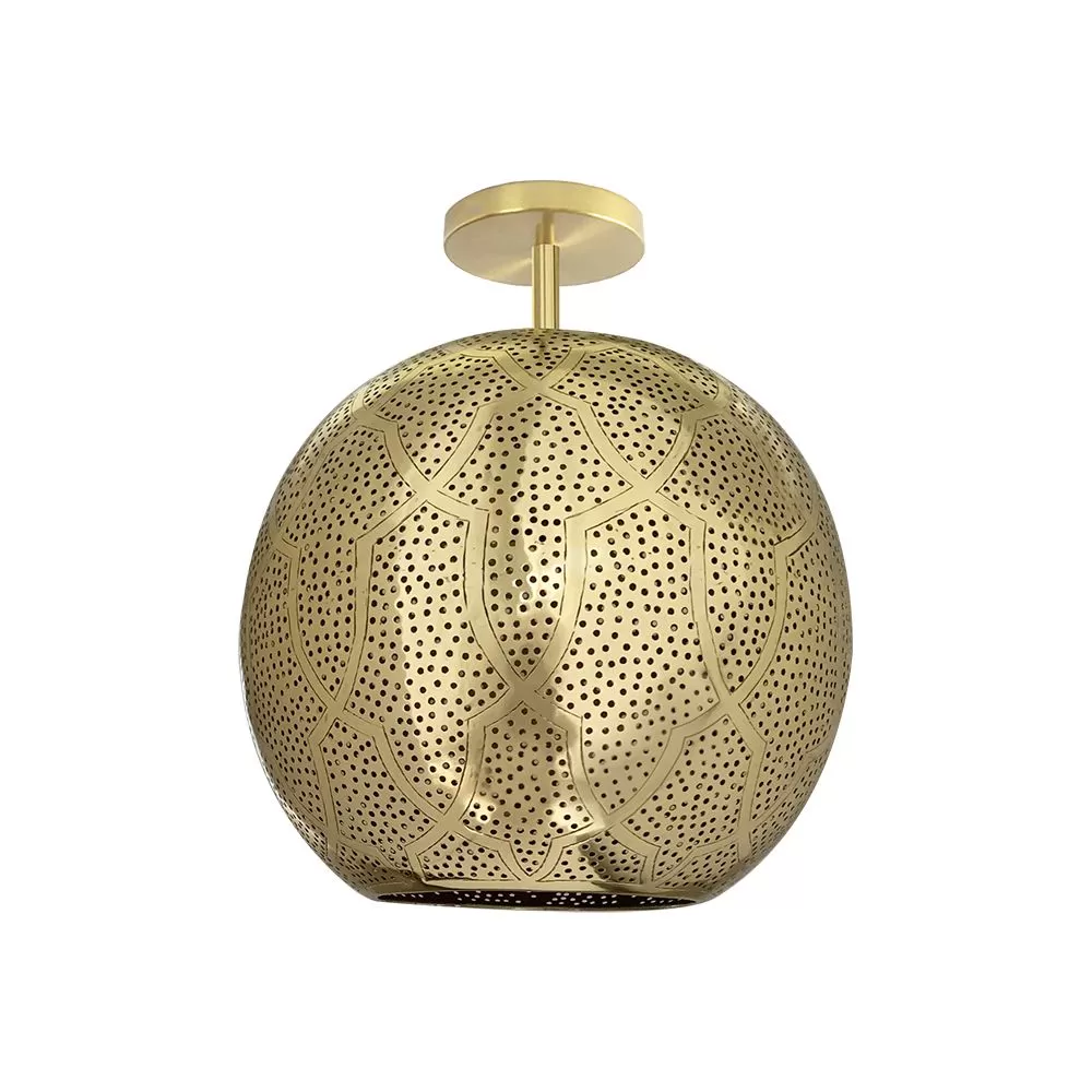 Aria is our modern Moroccan semi-flush light made from semi-precious punched metal and pierced designs. The sphere shape is modern with a hint of mid-century. It’s handcrafted by master artisans in the heart of Marrakech, Morocco. The intricate holes create a stunning shadow pattern onto the walls allowing the light to shine through for amazing ambient light. What an amazing way to bring a luxurious global feel in your home and add a touch of the beautiful city of Marrakech.