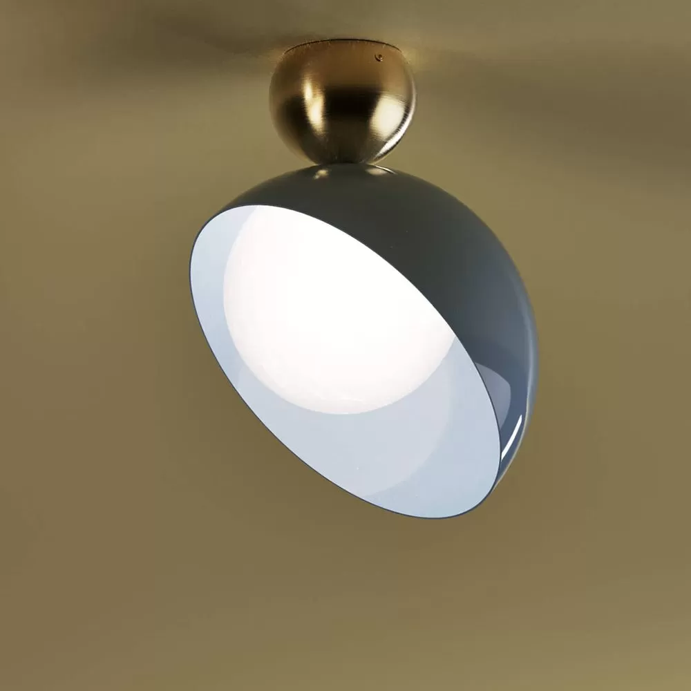 Aurora is an eclectic and colorful collection. A multifaceted soul with a seductive retro allure, Its naming alludes to the light that takes over the sky just before sunrise, and the finishes recall the colors of early Italian industry. Available in every versions, it includes floor, table, ceiling, suspension and wall solutions. Ceiling lamp with structure and decorative parts in metal available in Ancient White, Yellow Sunrise, Baby Blue, Baby Pink and Cappuccino. Middle sphere with brushed light gold finish. Diffuser in white glass.