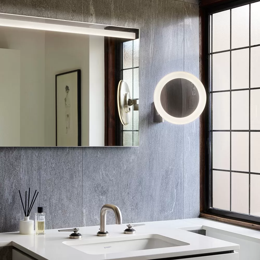Avlon 1200 wall mirror and light is available with or without 0-10V dimming. For smaller spaces, you can find Avlon 900 LED wall mirror–which can be installed either horizontally or vertically–in the “Family & Similar” tab below.