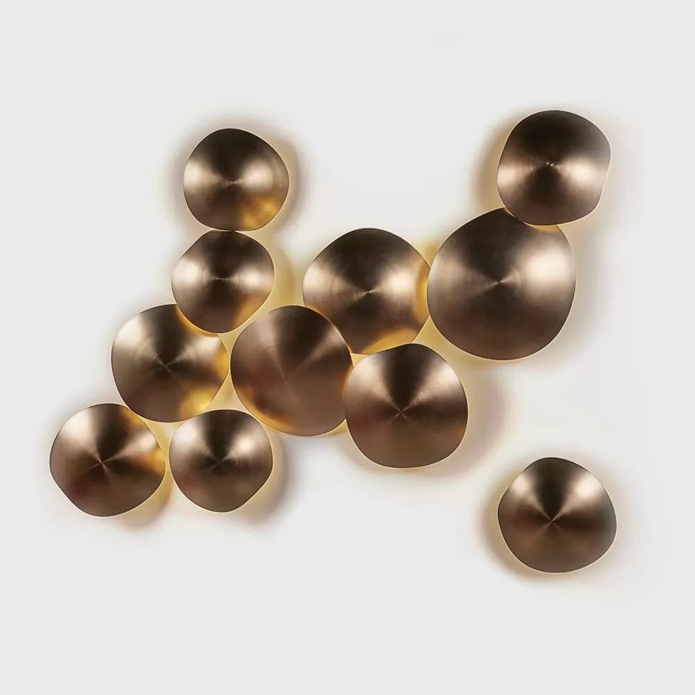 Organic. Transformative. Iconic. Metal light fixture with champagne finish. Fixture can be installed on the ceiling, as a wall sconce or used as decorative art. Available in four standard clusters with four, six, nine or eleven metal plates attached to a singular j-box. The angle of each plate can be adjusted individually. Includes a white diffuser.