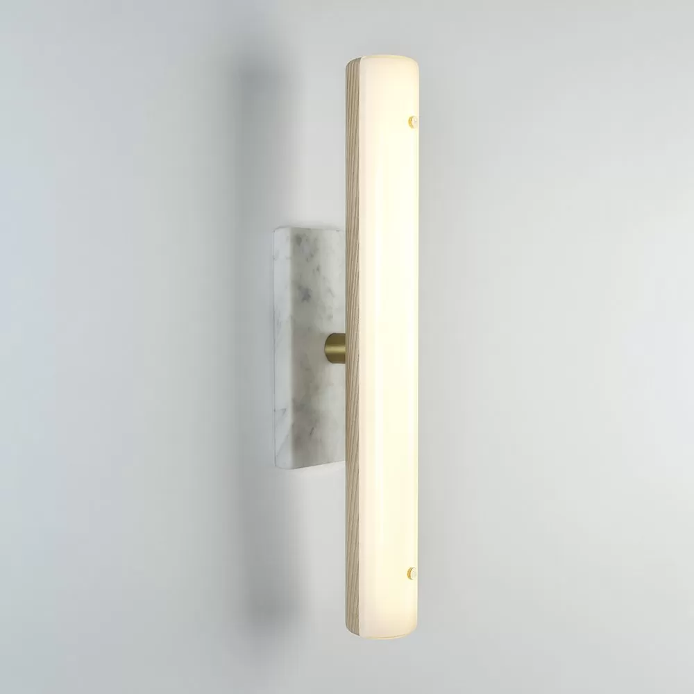 Counterweight is a series of LED fixtures made of gently arching, steam-bent wood that uses marble and brass as ballasts. Whether acting to cantilever the arms of the mobile light, or fixed as the base of the floor lamp, the mass of the stone and metal acts as a foil to the otherwise lightweight frames.