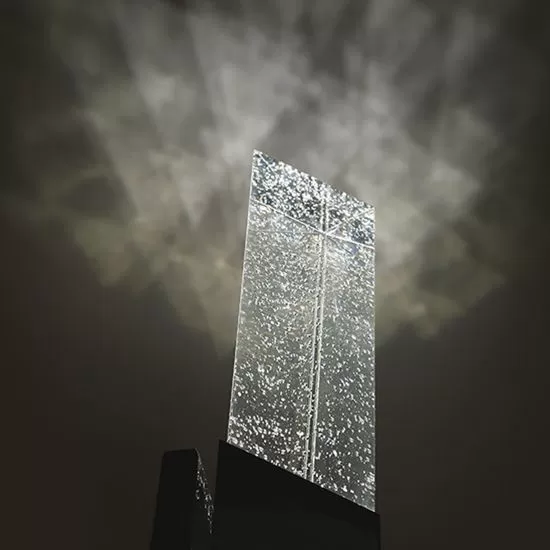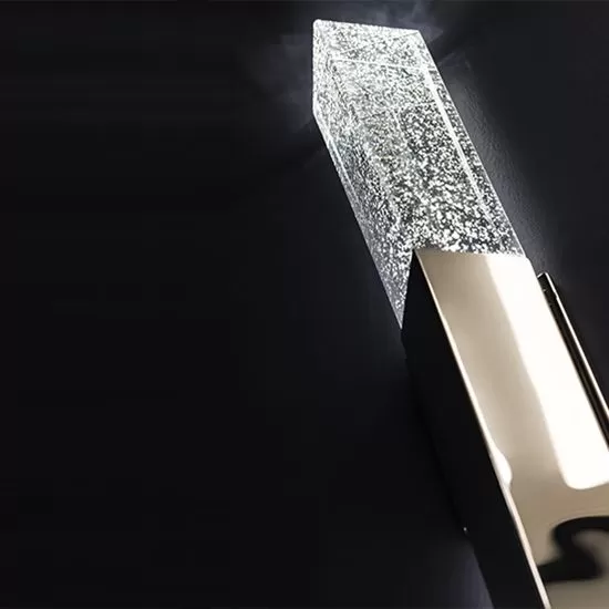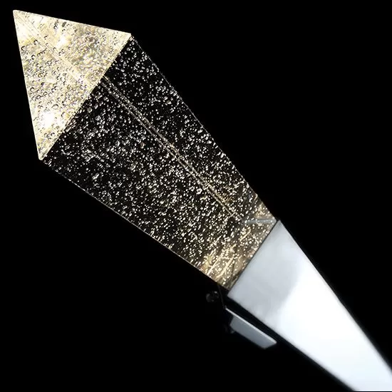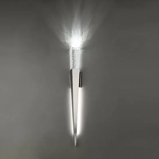 A triumphant staff of silver and light, Elessar makes a dramatic statement wherever you mount it. Seeded crystal sparkles with light and casts a captivating spell, while LEDs positioned in the back of the polished stainless steel body create fine indirect light against the wall for a fuller illumination. Energy-efficient and long-lasting, thanks to cutting-edge LEDs and a timeless design, Elessar is a distinctive sconce for modern hotels, luxury condos and midtown office buildings.