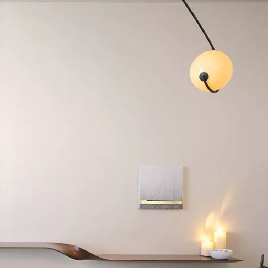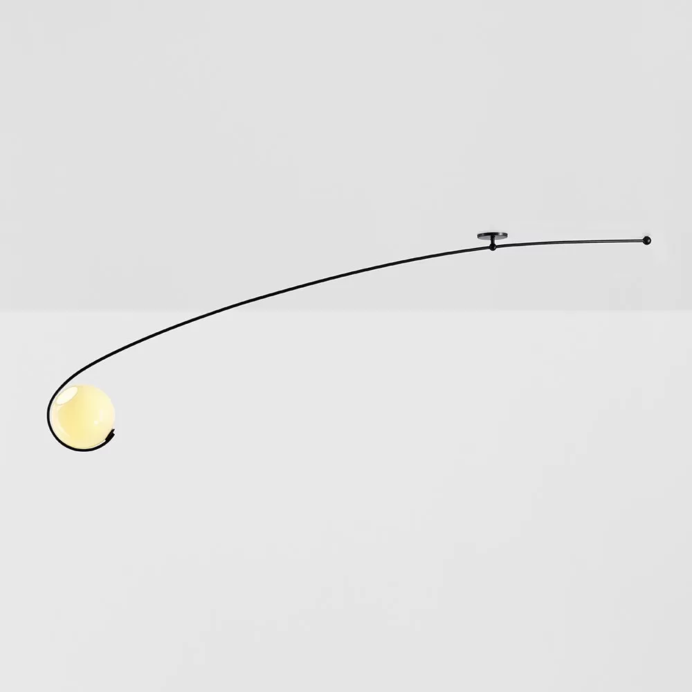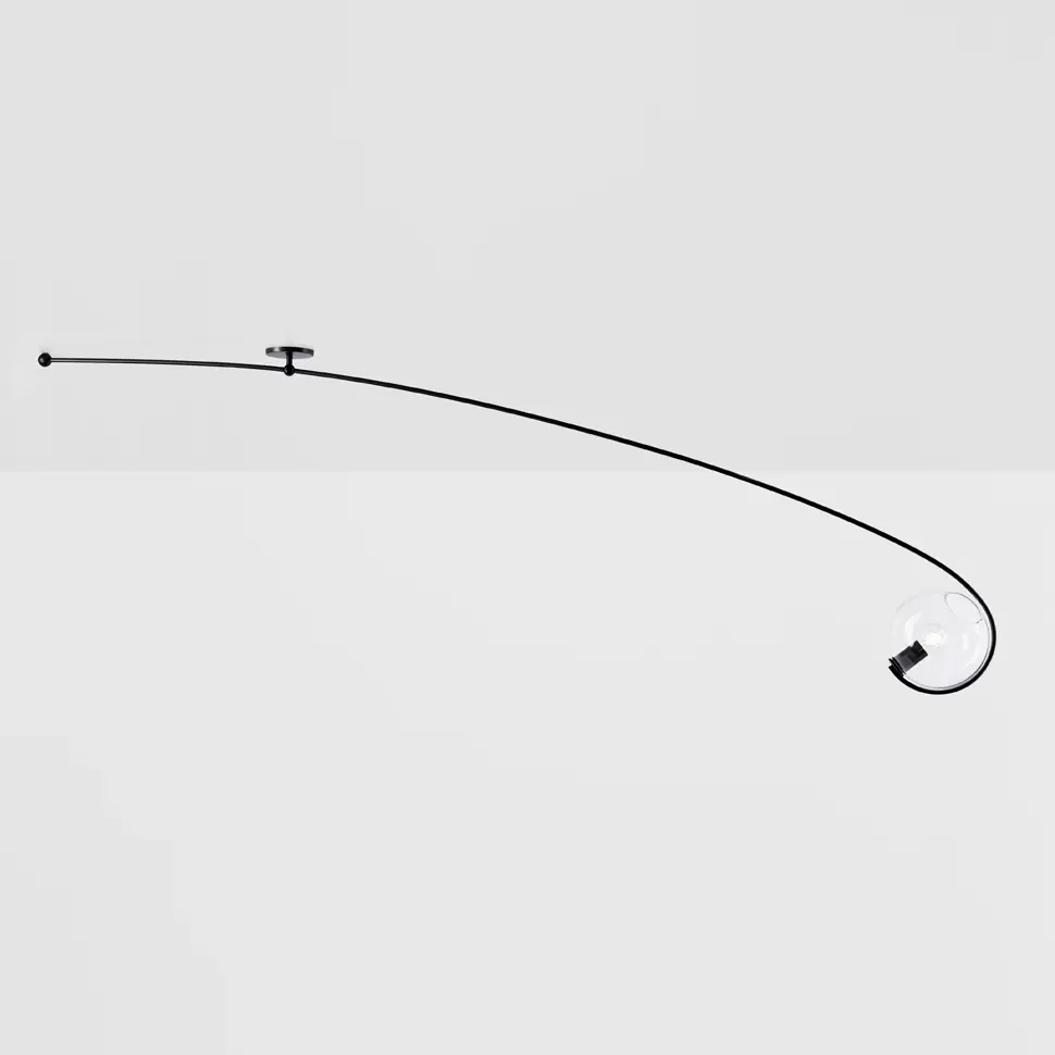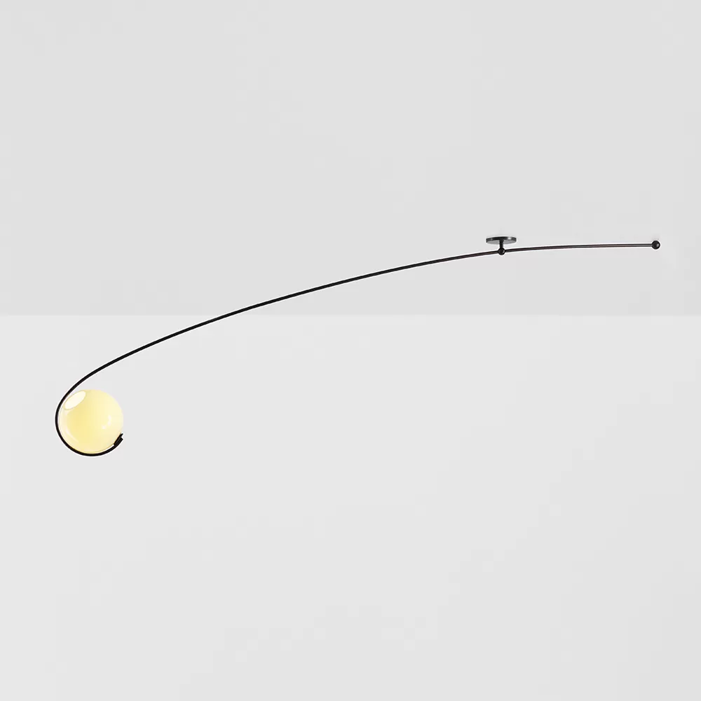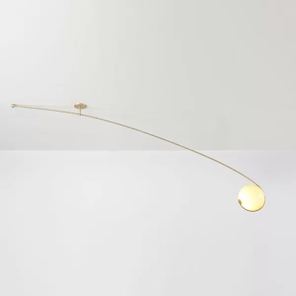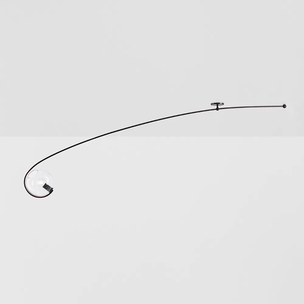 Jason Miller’s Fiddlehead derives its name from sprouting ferns. One end ofFiddlehead’s long, furling arm gently balances a hand-blown glass globe; the other uses the wall or ceiling as a counterbalance.