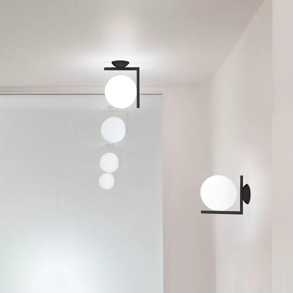 IC Lights C/W by renowned designer Michael Anastassiades consists of a thin frame of steel that bends at a 90-degree angle. From there, a blown-glass opaline orb delicately balances. The ceiling- and wall-mounted lamp, which casts diffused light, is now available in a brand-new black finish that adds dimension to the stunning collection of deceptively simple designs. IC Lights C/W can be mounted on a wall or mounted on the ceiling.