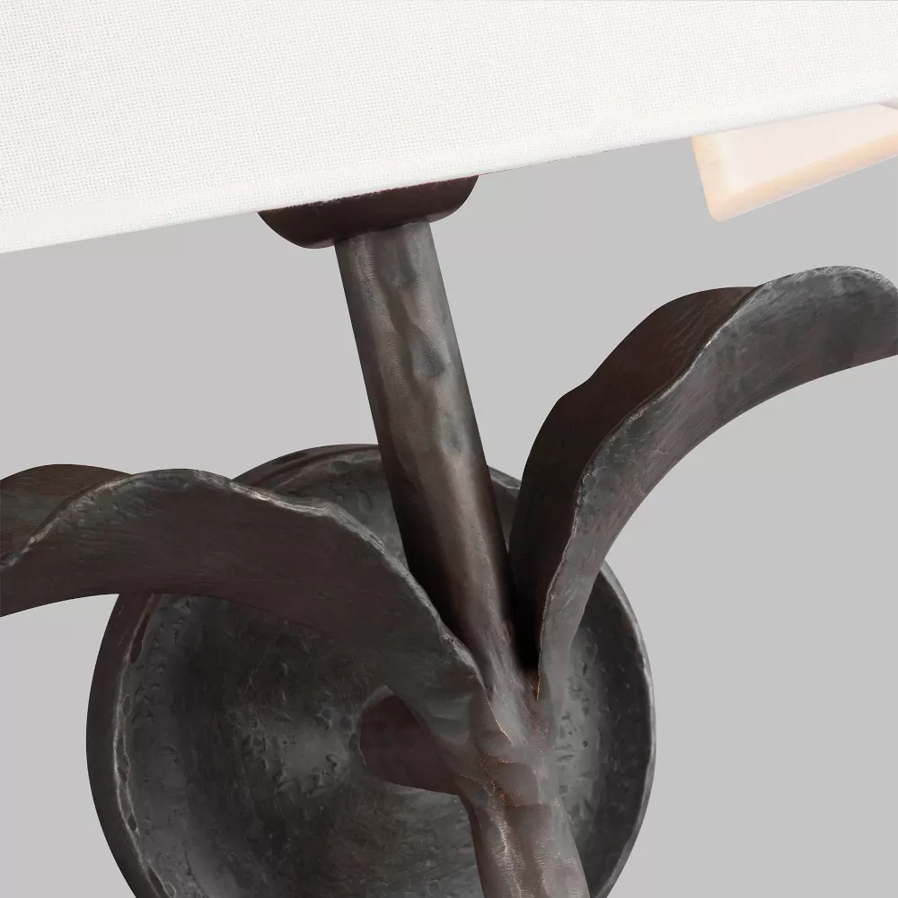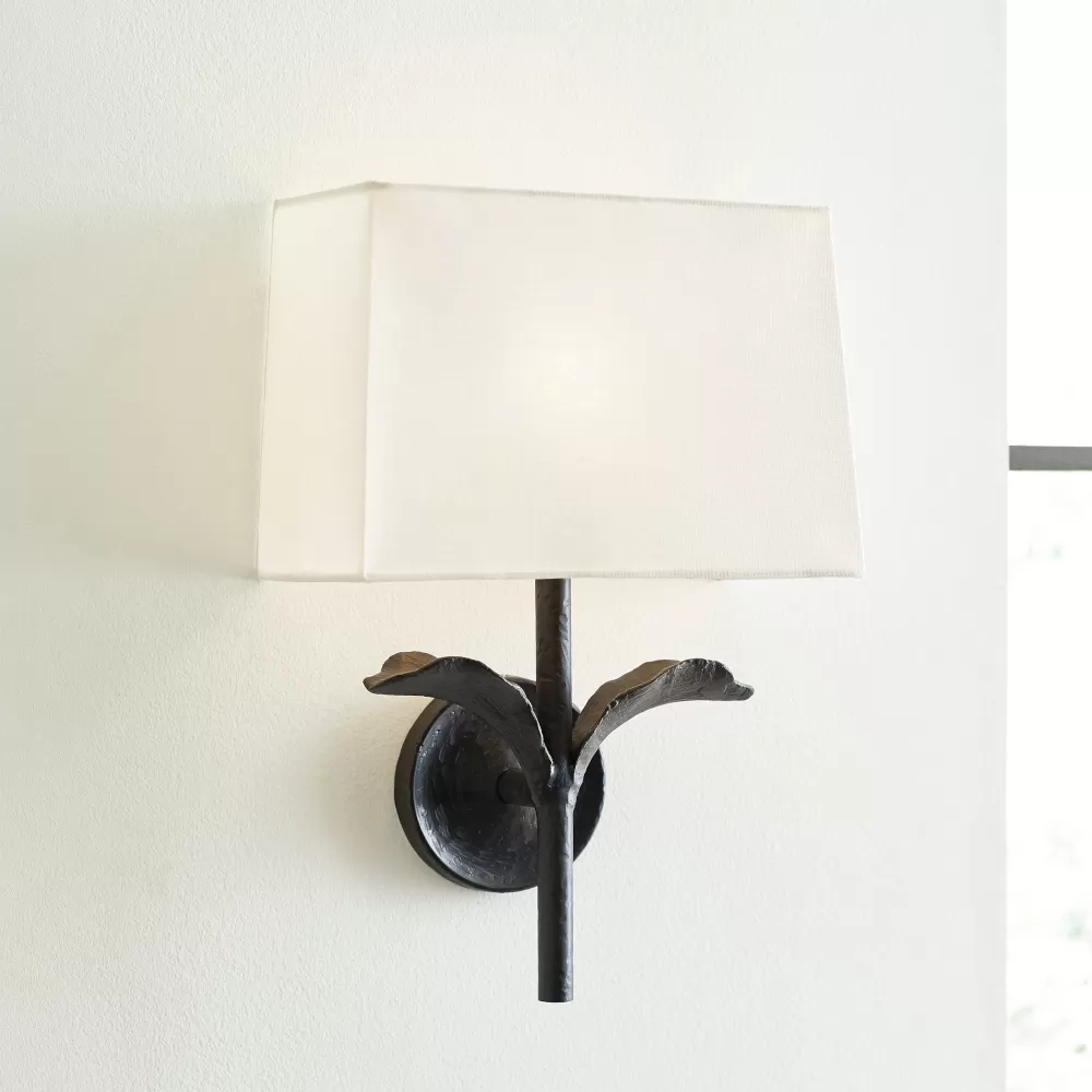 The Georgia Wall Sconce channels the natural beauty of flourishing leaves with perfect symmetry balanced by a circular backplate and a rectangular shade in fresh White Linen. Superior craftsmanship using a lost-cast wax technique results in a textured Aged Iron finish that resembles hand-forged iron.