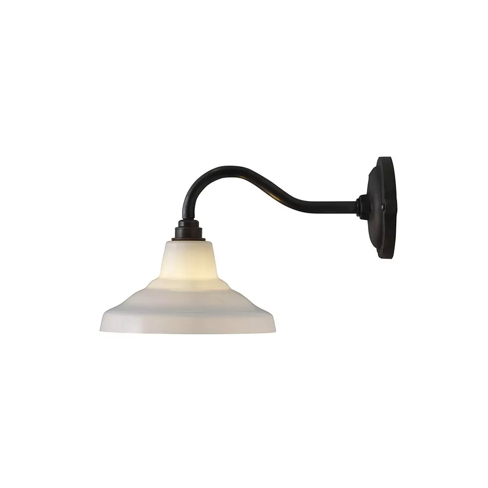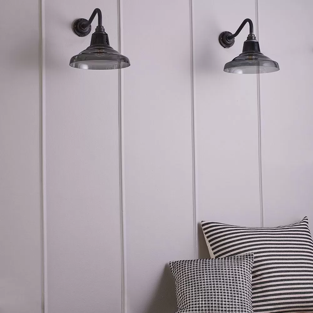 A smaller version of Davey Lighting’s classic School Light, produced in hand blown glass, and designed as a compact wall light fitting. The glass shades come in either opal, anthracite and clear glass, with a weathered brass arm and back plate. The anthracite and clear glass shades show off the filament exposed light bulb, a nod to this continuing lighting trend.
