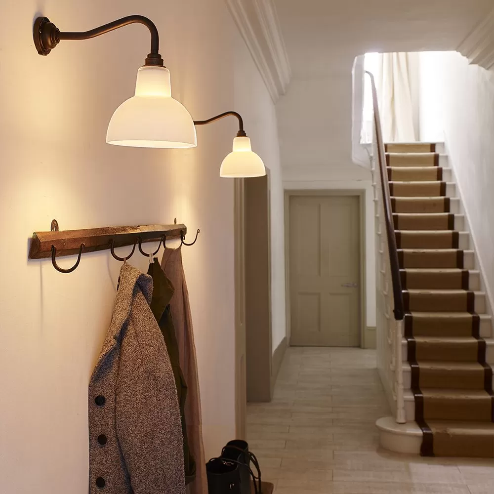 The York Wall Light is one of Davey Lighting’s latest designs. Inspired by Davey’s best selling ‘spun reflector’, the York is produced in hand blown glass, and designed as a compact wall light fitting. The glass shades come in either opal, anthracite and clear glass, with a weathered brass arm and back plate. The clear or anthracite glass shades allow the filament exposed light bulb to be seen, creating a dramatic effect, whilst the opal shade provides a more diffused illumination.