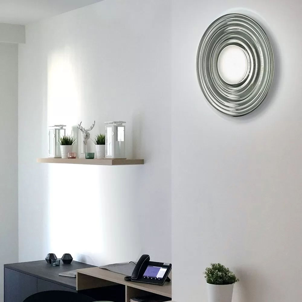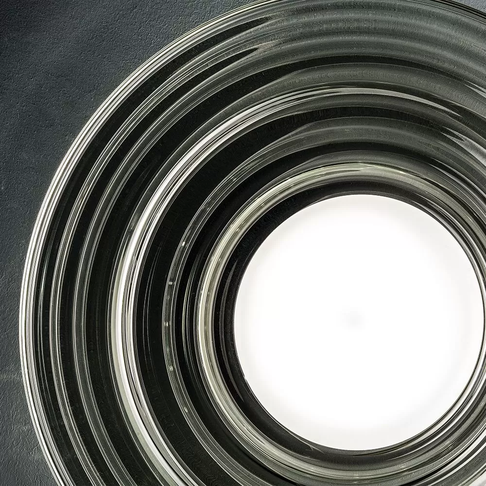 The Gravity wall/ceiling fixture features a central glass diffuser in three different finishes: transparent, fumรจ or black. The frame is available in iron grey metal and chromium finish.