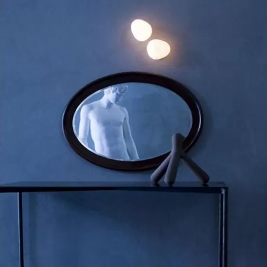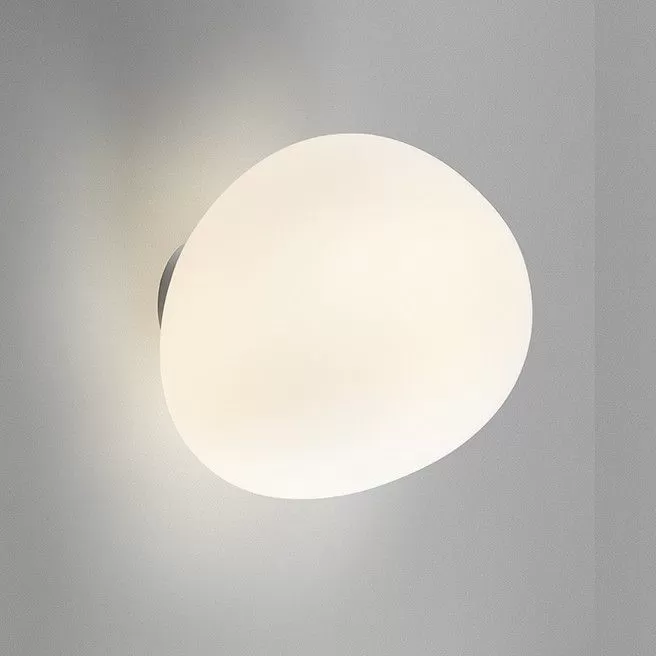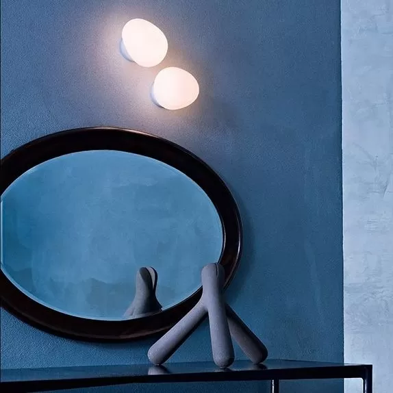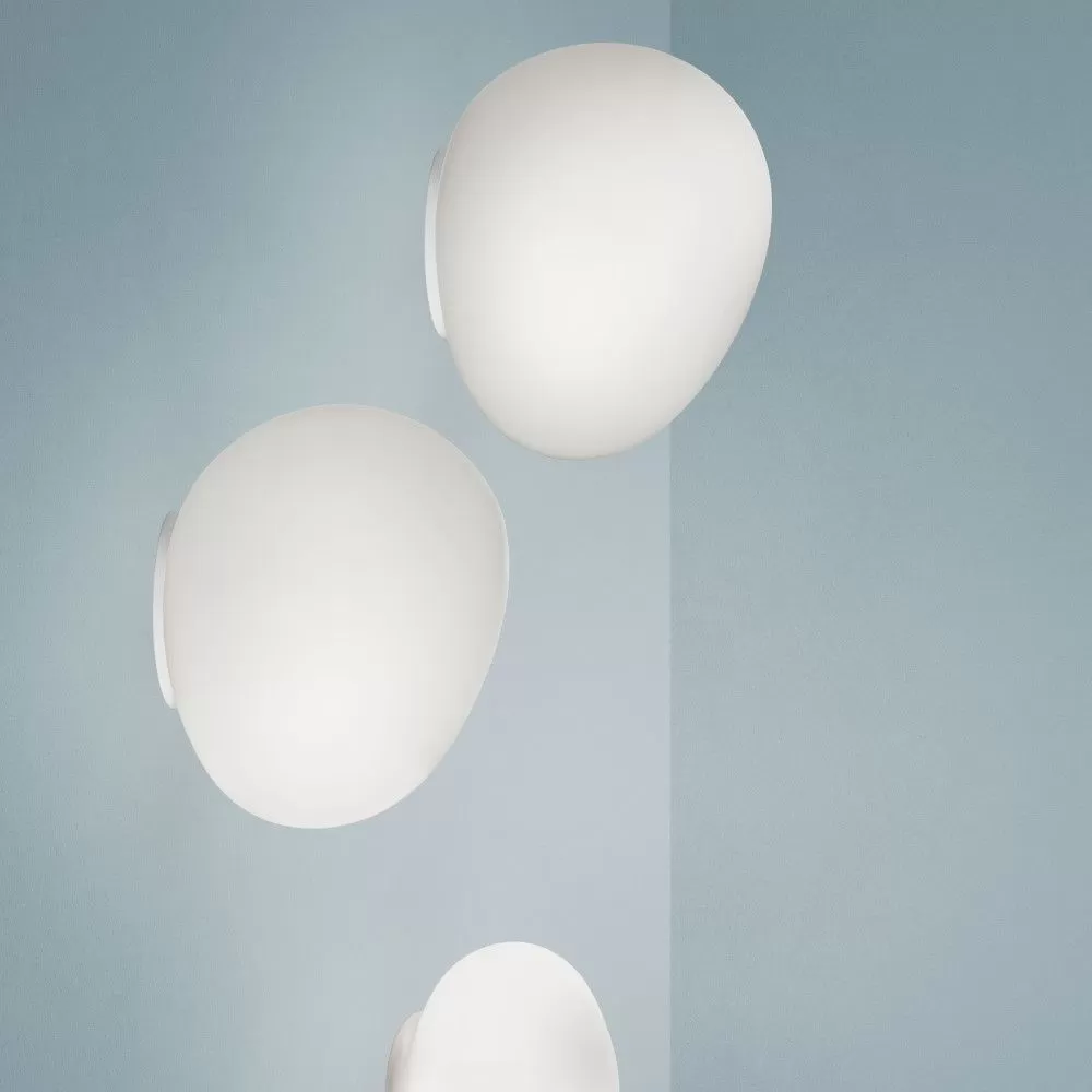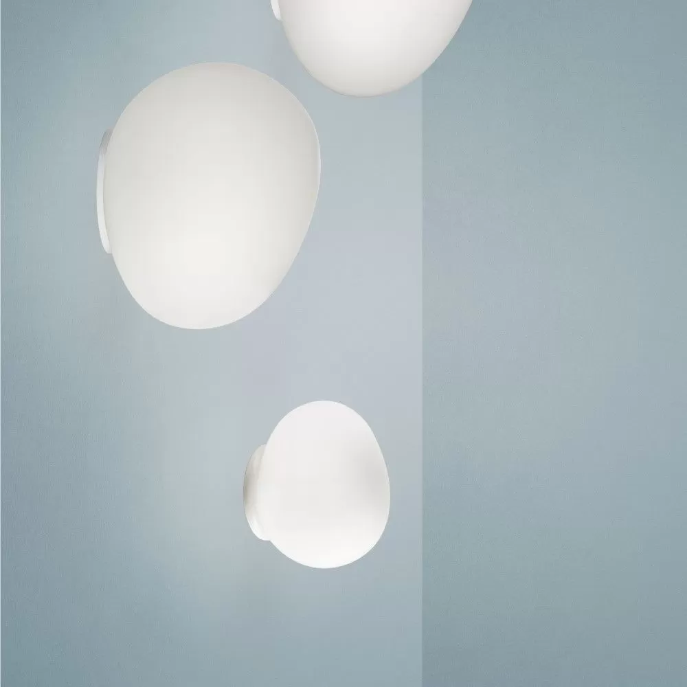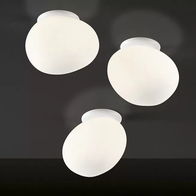 Wall or ceiling lamp with diffused light. White satin finish hand-blown diffuser achieved using glass blowing procedure without turning the glass in the mould (referred to as “stationary”), subject to immersion in acid. The glass in the medium version is incorporated with a matt transparent injection moulded polycarbonate ring nut, which is in white polycarbonate in the small version. Wall fitting in epoxy powder coated metal and matt injection moulded transparent polycarbonate lamp holder support.