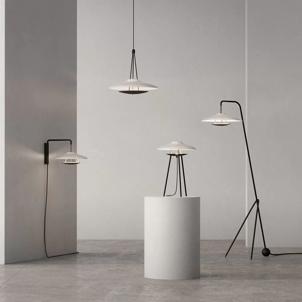A poetic and industrial motif is coupled in the delicate and evocative lamp collection Haro, named after the Japanese word for βhaloβ. Poised on a slender matte powder coated metal base, a refined, floating opal glass shade is repeated across the collection, creating the glowy, ambient layer of light for a multitude of uses.