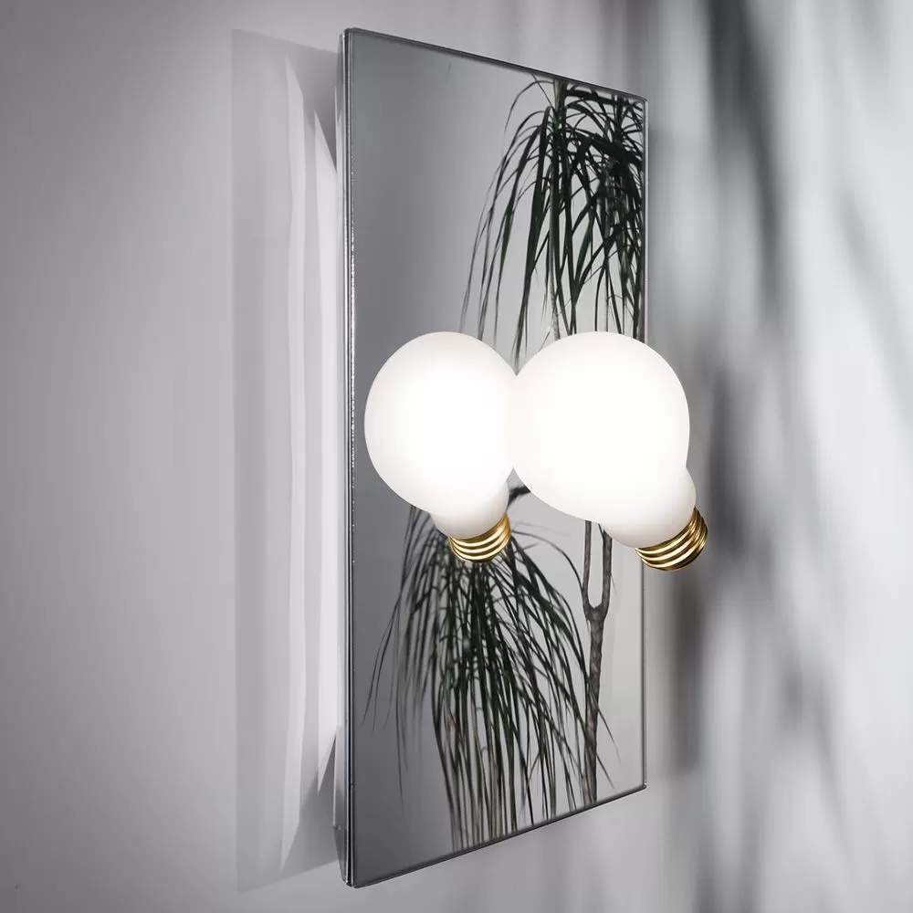 They say inspiration comes on like a lightbulb going off in your head. Idea strips away design, leaving the essence of light; a three-dimensional “bulb” and a brass-finish screw base, magically suspended on a wall-base that comes in a brushed brass, mirrored, or white matte finish. Also available in a recessed wall lamp version that plays on the unexpected, ironic effect of an idea popping up when, and where, you least expect it.