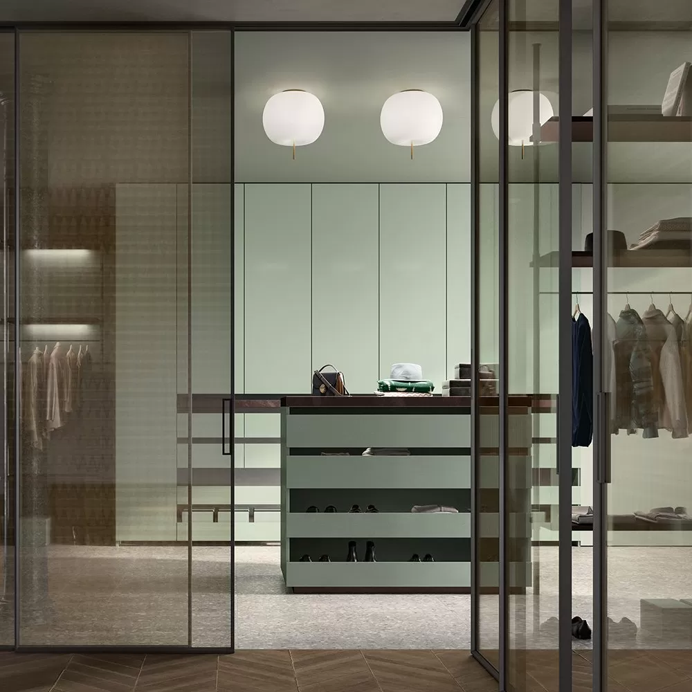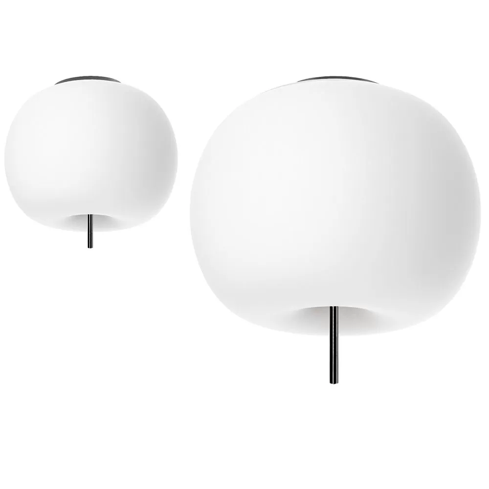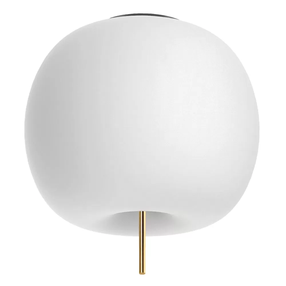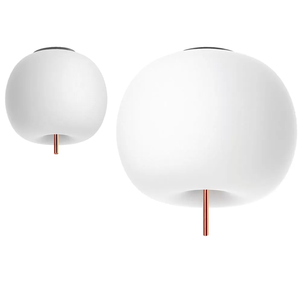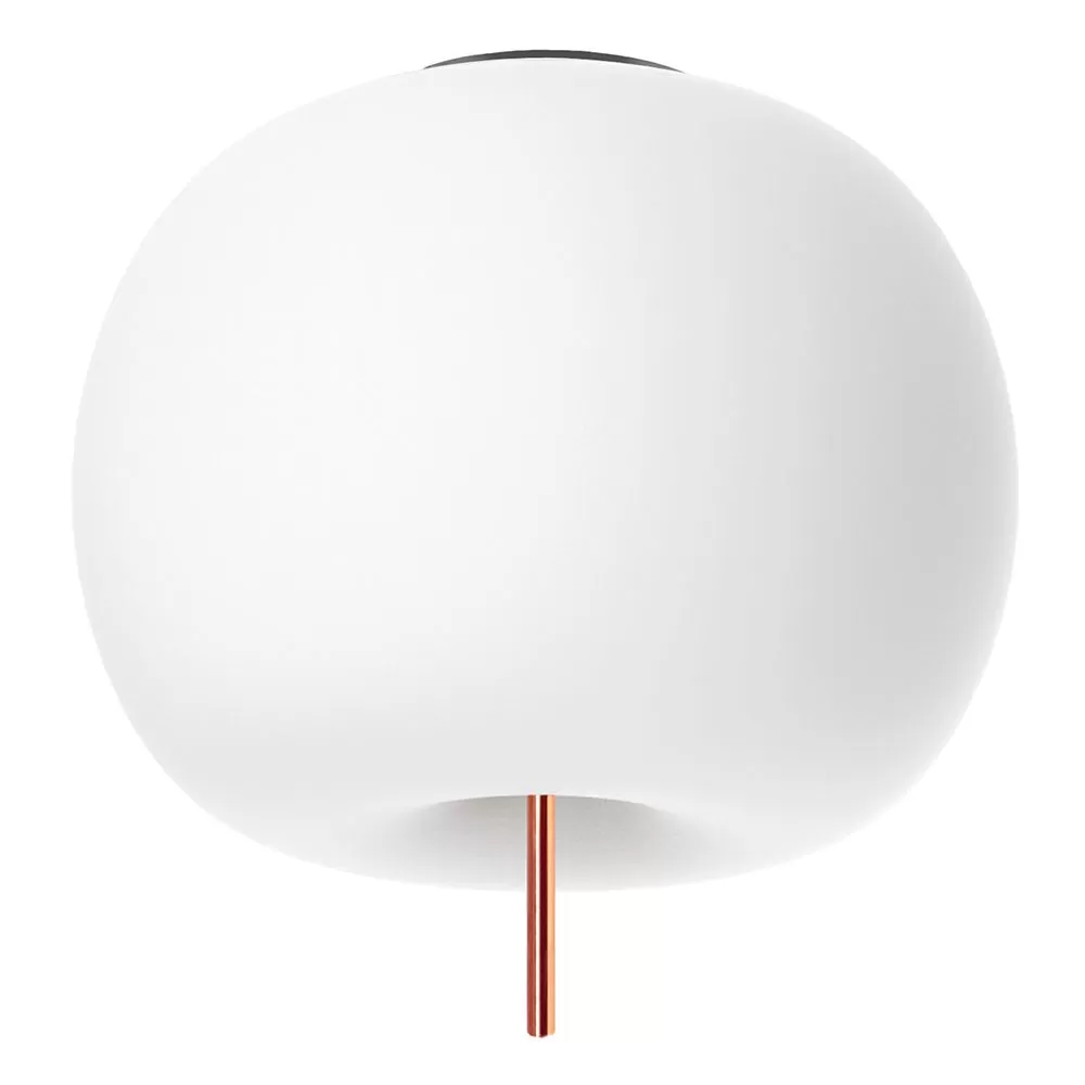 A collection of lamps with round shape and apparently soft and fluffy, almost organic. Ceiling lamp. Opal diffuser made of two layers of mouth blown glass. Metallic body available in three coating finishes: black, copper and brass.