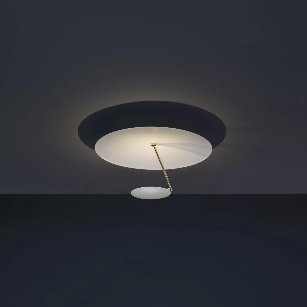 The Lederam C150 Ceiling Lamp is the latest addition to Enzo Catellanis Eco-Logic Light Collection. Comprised of a large disc connected to a smaller disc with nickel joint via metal rod, light emanates upwards from the small disc onto the larger disc, casting a delicate ambient glow. Available in different colour combinations that include white, gold, satin, black, and copper.