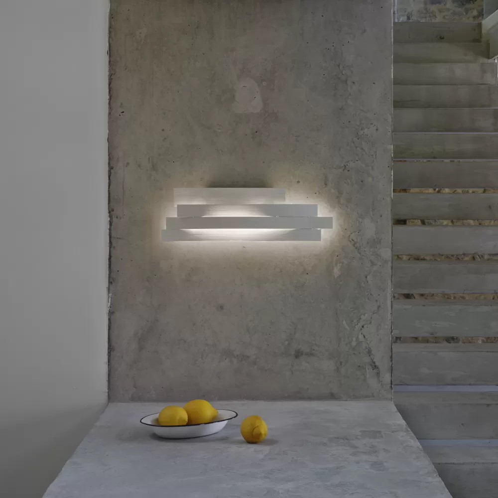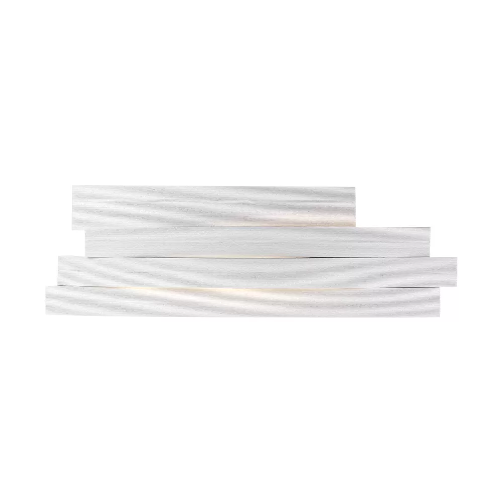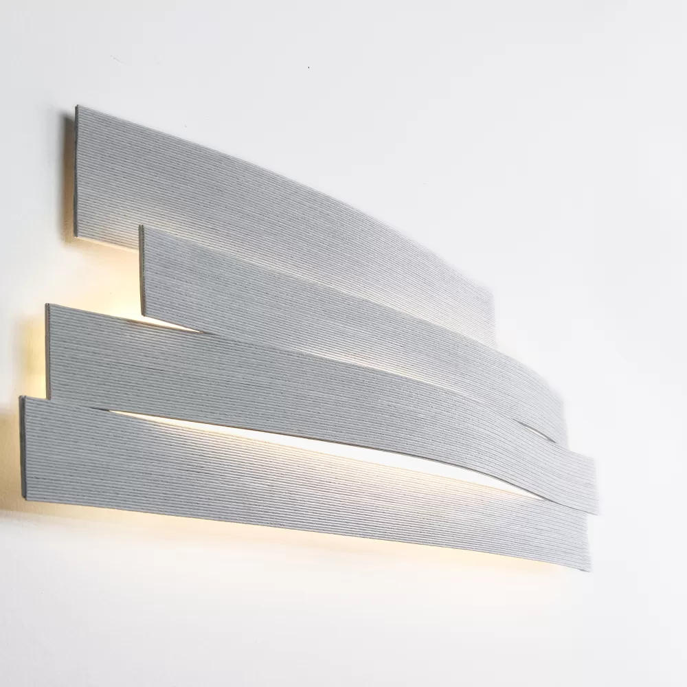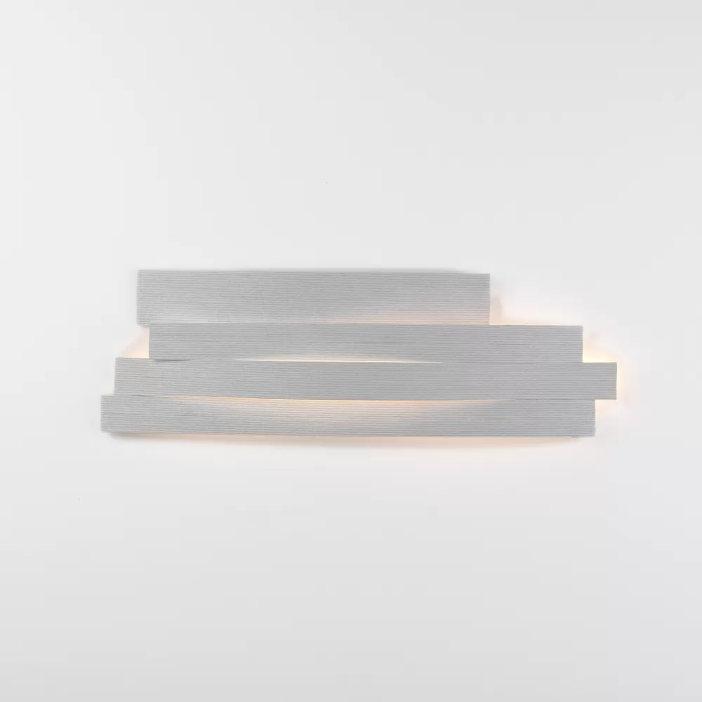 This collection of wall lamps is made with strips of pressed cellulose obtained by an organic recycling process. The material, used in Japan for packaging purposes since the 16th century, for its great resistance, has resulted ideal to create the different length curved lines that compose the lamp. The use of LED technology contributes to reinforce the sustainability of this object, that just like soft sea waves, bathes walls with the subtle brightness that shines through its bands.