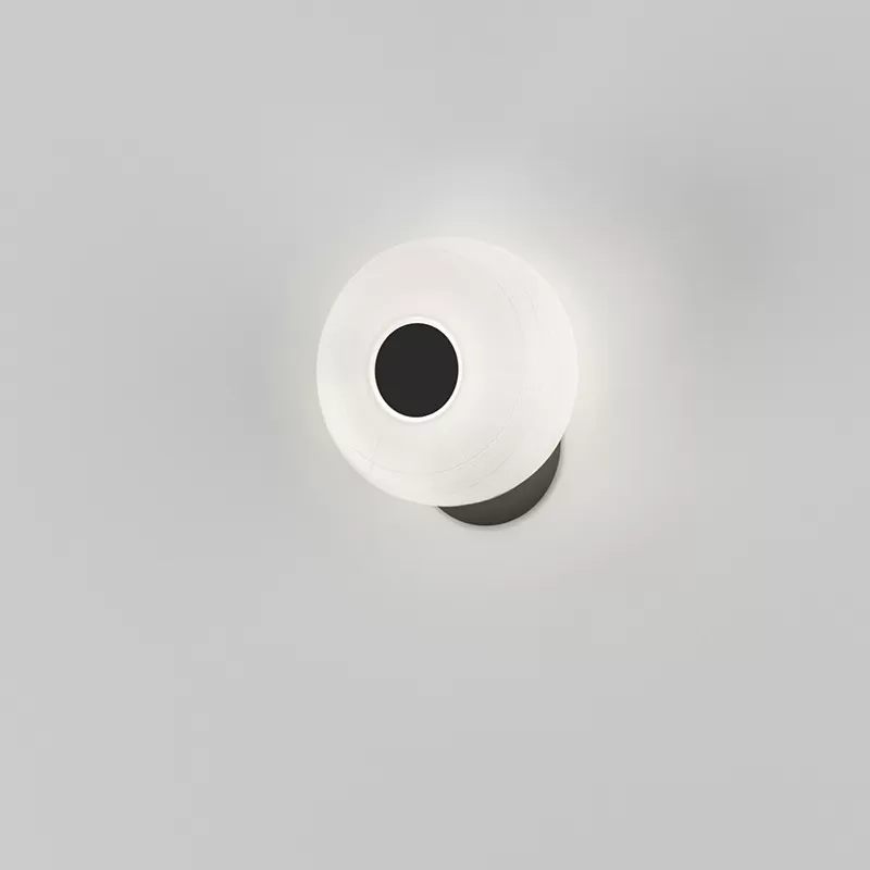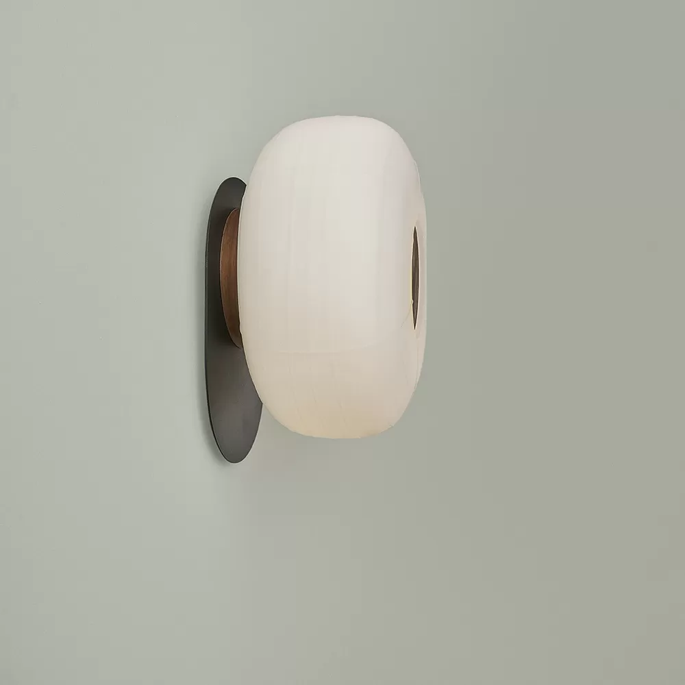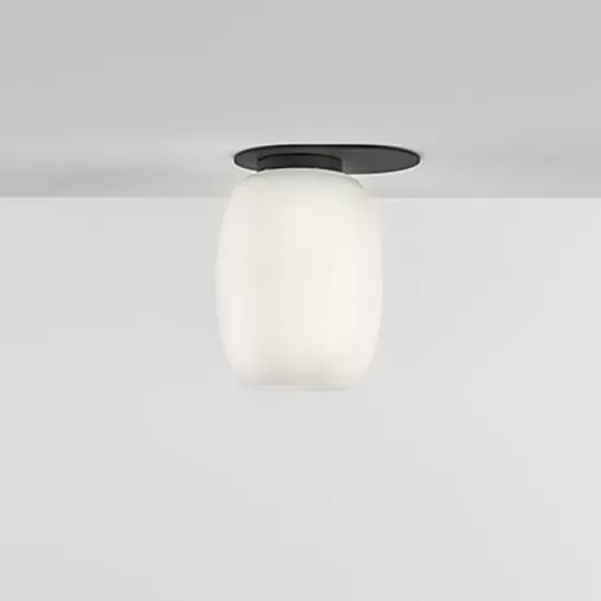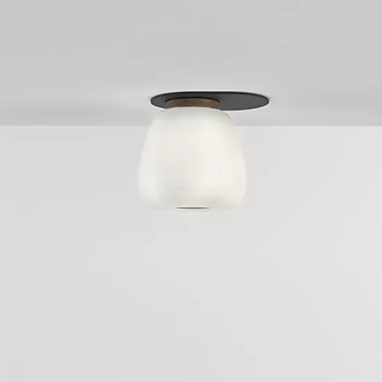 Japanese-style ceiling lamp, available in three sizes (C/W15, C25 and C35). Made with a disc that holds a source of light (E27). This disc can come in natural walnut or painted in matte black and supports the textured blow-glass diffuser with an opal matte white finish.