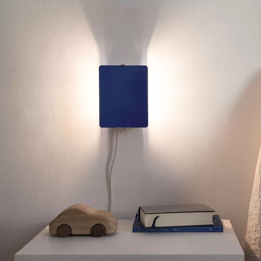Wall lamps with adjustable aluminum volet and metal body. Body painted in white, volet in natural or black anodized, or mirror painted stainless steel. For the small versions E12 and LED, volet could be painted in red, yellow or blue. E12 version with integrated switch, cable and plug for a simple and free installation. Indirect output towards the wall and orientable flood beam.