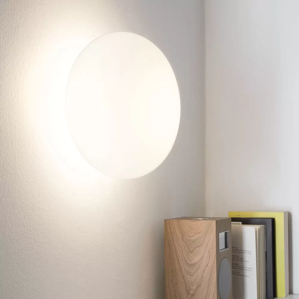 Pendant and wall/ceiling lamp with diffuser in opal blown glass. Spring transparent plastic fixing or chromed wall fixing.