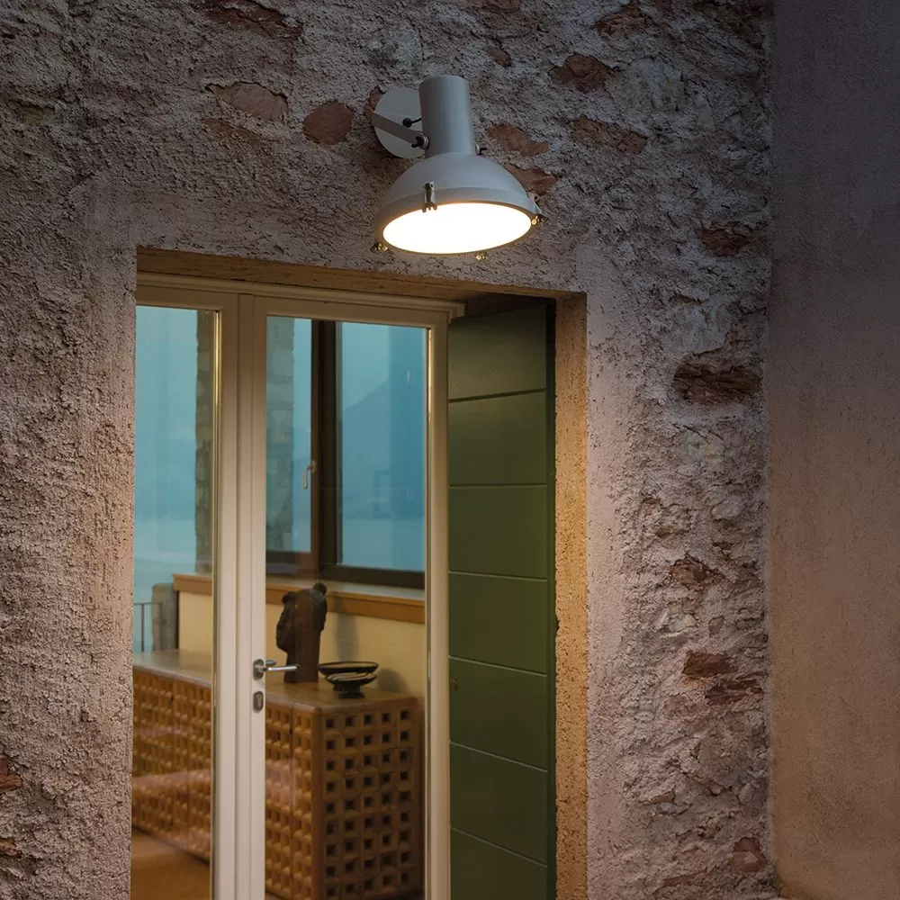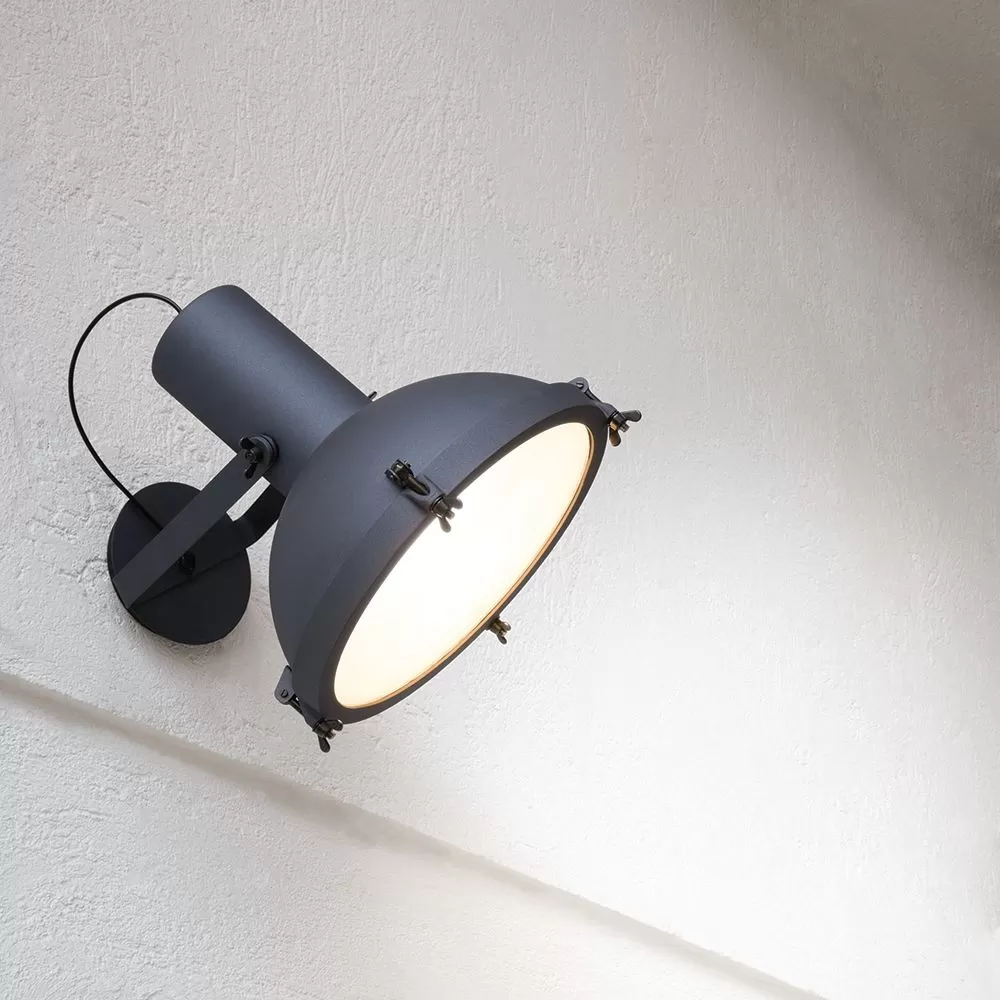 The Projecteur of Le Corbusier was designed for the Chandigarh High Court, India, in 1954. Aluminum body painted in night blue, white sand or moka. Diffuser glass curved and sandblasted in the inner part. Painted body, base and canopies. Screws and small metal parts black chromed. Available in the floor, wall/ceiling and pendant versions. The wall/ceiling and pendant lamps are available also in the outdoor version.