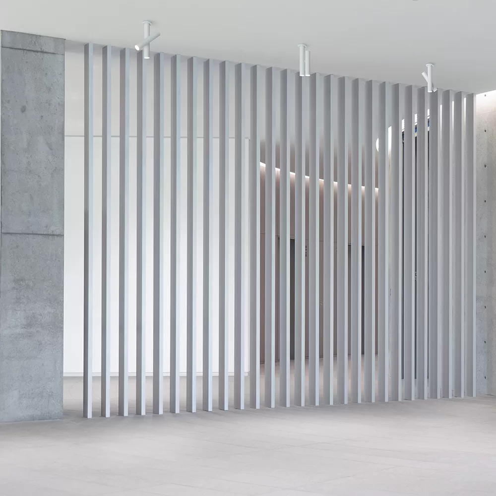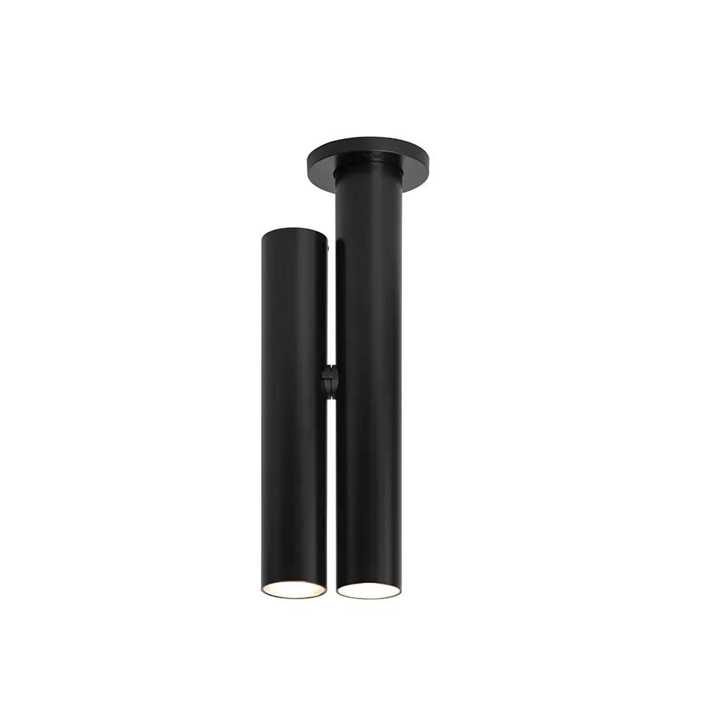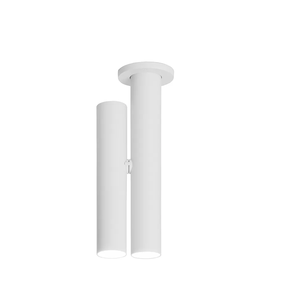 The latest addition to the TUBES collection, composed of tubular elements in extruded aluminum. A more compact and powerful ceiling version, with two vertical tubes, one fixed to the ceiling and one rotatable like an arm and adjustable to user needs. Both cylinders have a 340° rotation. Available in white and black. Opal polycarbonate diffusers.
