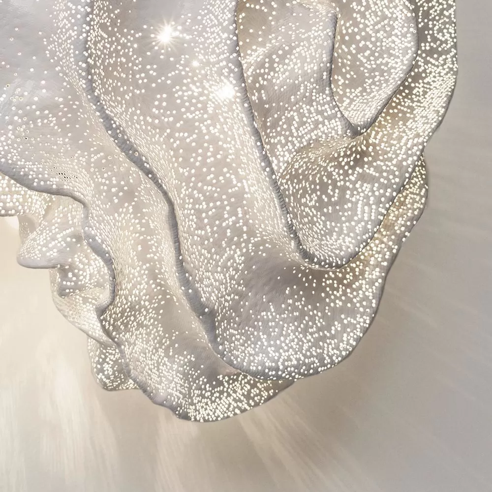 A collection that reflects the extreme malleability of SIMETECH better than any other. The unrepeated organic forms of the Nevo, with its hand moulded curves, makes every lamp a unique design, different to the rest. Its volumes seem to be alive, in constant evolution and movement, due to their shape and the folds in which the light plays. It is one of the largest collections of the firm, including pendant lamps, floor and wall ones, and even chandeliers in cascade.