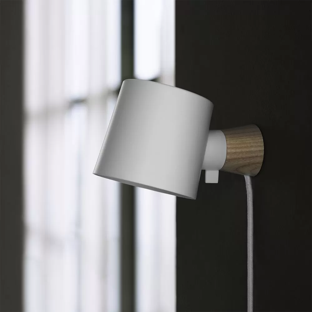 The Rise wall lamp consists of a base and a cylindrical shade held together by a turning joint, making it 350 degrees rotatable with a small integrated handle. The shade is white on the inside with holes on top for an optimal light effect. The lamp is simply screwed on the wall and slide together. Rise is available in two editions; as plug-in (using the included power cord) or hardwired (installed directly to the power outlet).