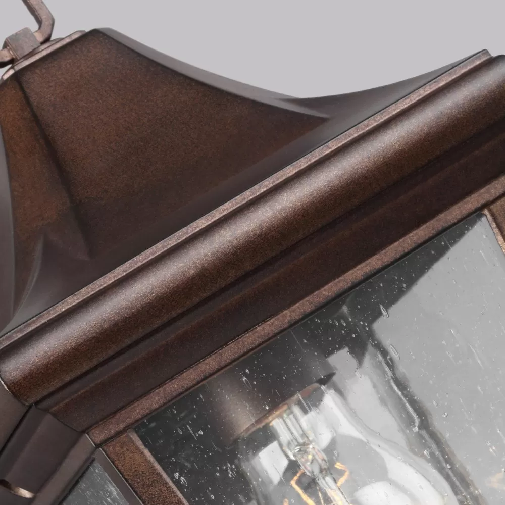 Inspired by a beautiful church, the Oakmont outdoor collection boasts incredible details, from the steeply pitched roofline and softly curved glass panels to an angular backplate, lovely curved arm extension and classic finials.