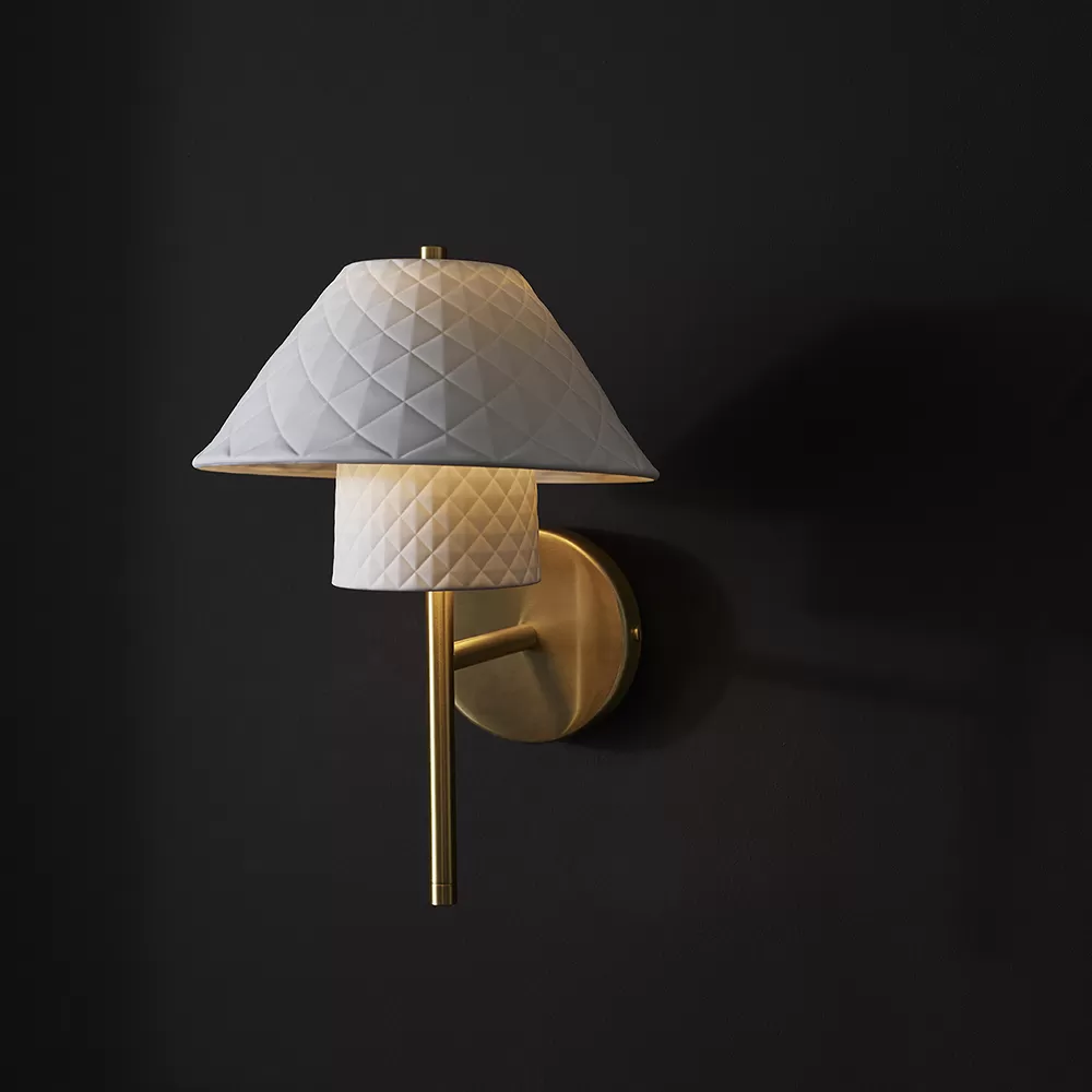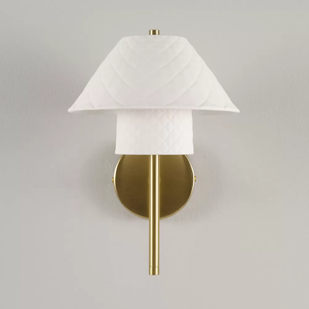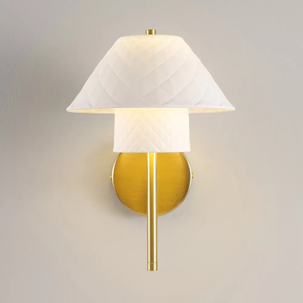 Continuing the Oxford collection comes the simple and elegant wall light. Once more the luxurious paired shades with their quilted texture are mounted upon a brushed brass backplate. Emitting a warm, atmospheric glow, the shades come to life when switched on, as the light interacts with crisp lines running across the textured surface.