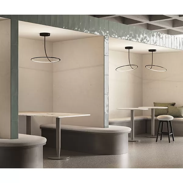 In Poise, human curiosity and the interaction with light source, are encouraged by the flexible section between frame and the circle, allowing the latter to be moved into any position. A vitality capable of creating ever-changing configurations defying gravity.