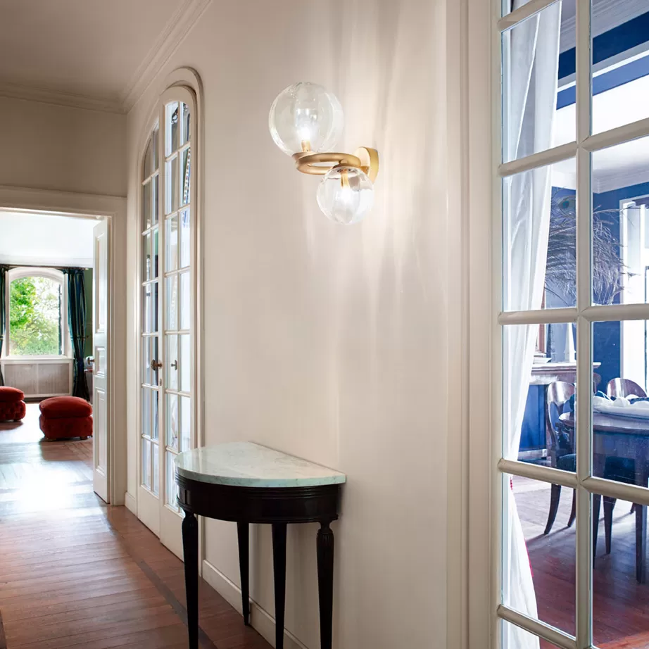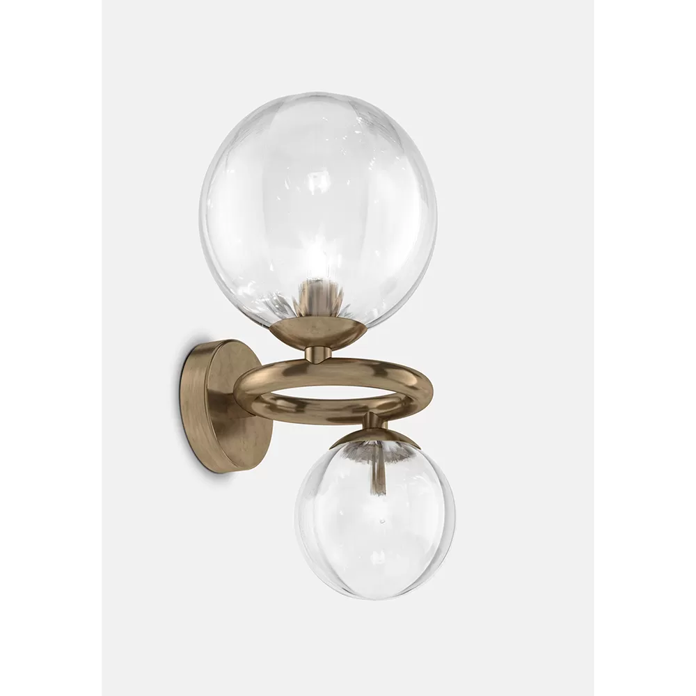 The distinctive feature of this model from the Puppet collection are the three rings with increasing diameter. They can be combined with different sequences to form the framework on which to place the three diameters of the precious glass spheres in three different sizes, which blend with the structure thanks to a preformation inside the blown glass. Aesthetically light and elegant, Puppet Ring ethereally combines glass and metal.