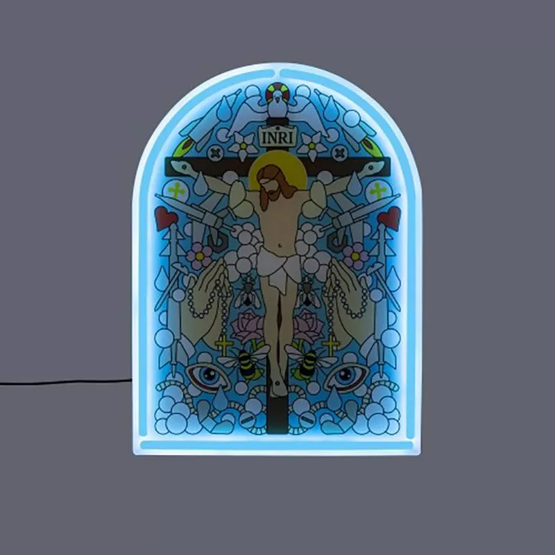 Angel Gabriel, the Virgin Mary and Jesus on the cross become a series of holy neon lights, ready to fill your life with a divine glow. Get your daily dose of biblical funk!