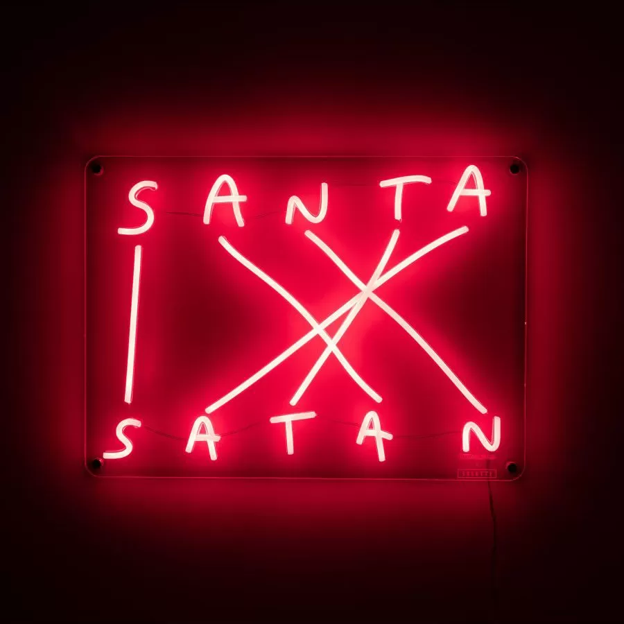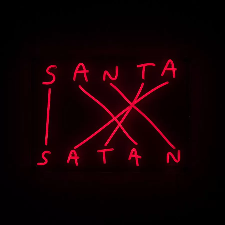 Dream-Merda, Resist-Sister and Santa-Satan are the union of the opposites and a fight between them. A reflection on the daily translated into an unprecedented LED work.