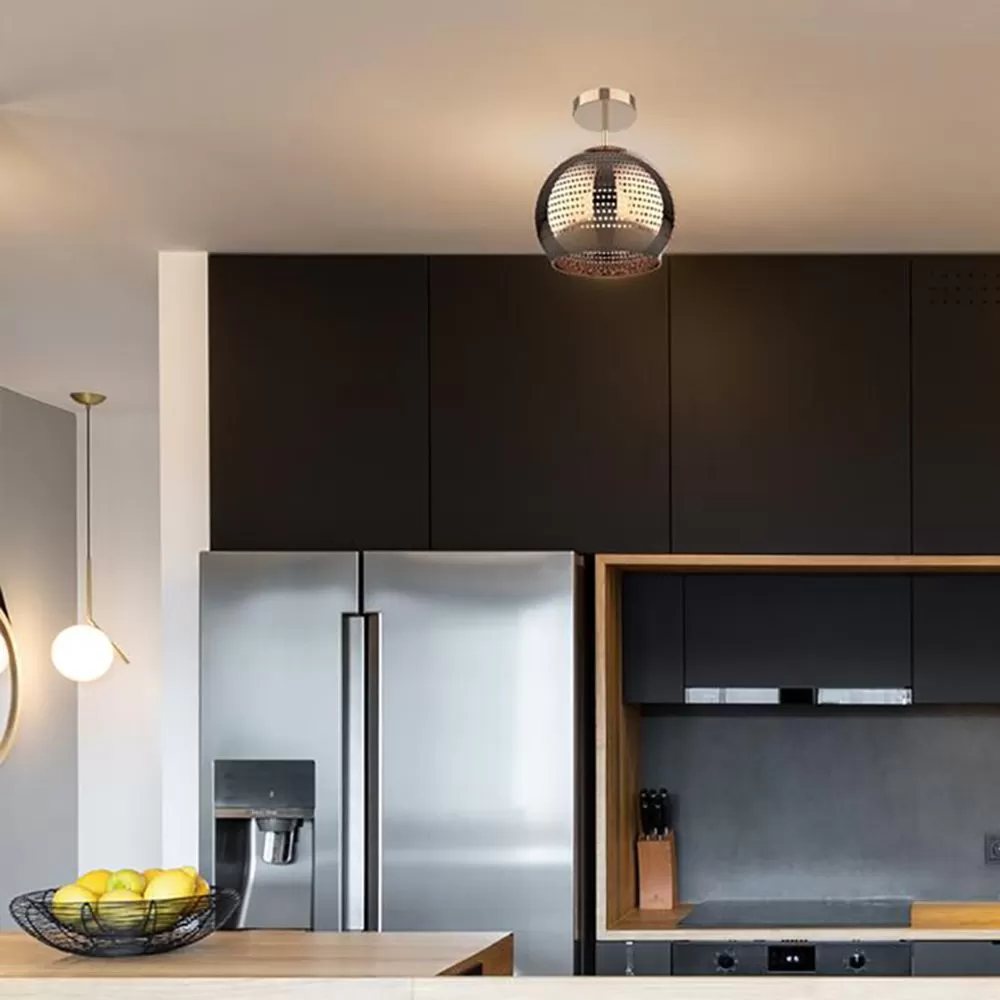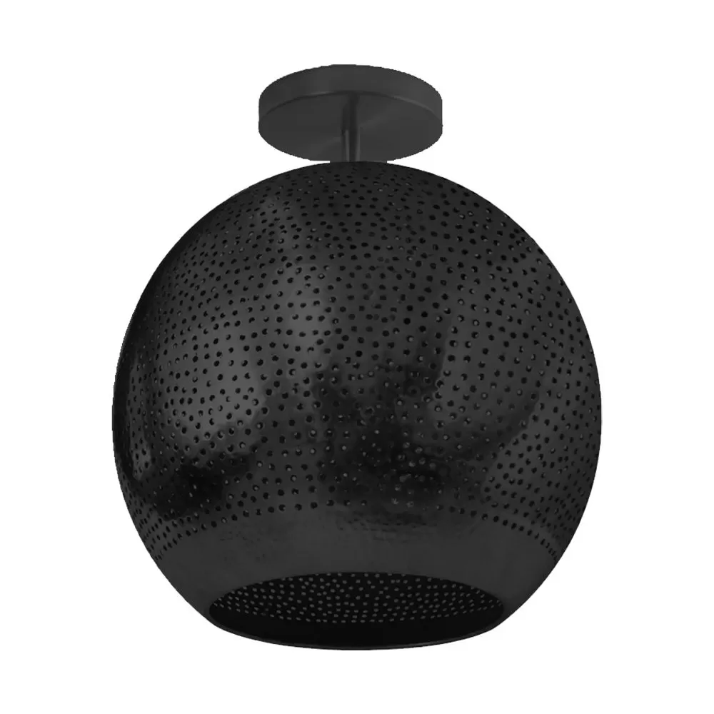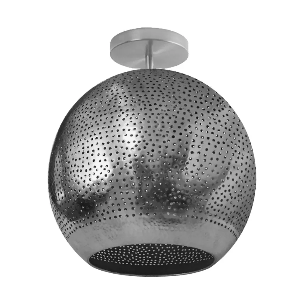 Shams Semi-flush light is the sun that never sets. This luxurious ceiling light provides the perfect ambient glow and offers a warm, modern look. Its tiny hand punched perforations throughout its body allow it to create a soothing envelope of soft, ambient light. The domed shape of the shade is constructed out of durable semi-precious metals that are hand-shaped and hand-finished to perfection. May be wall or ceiling mounted.