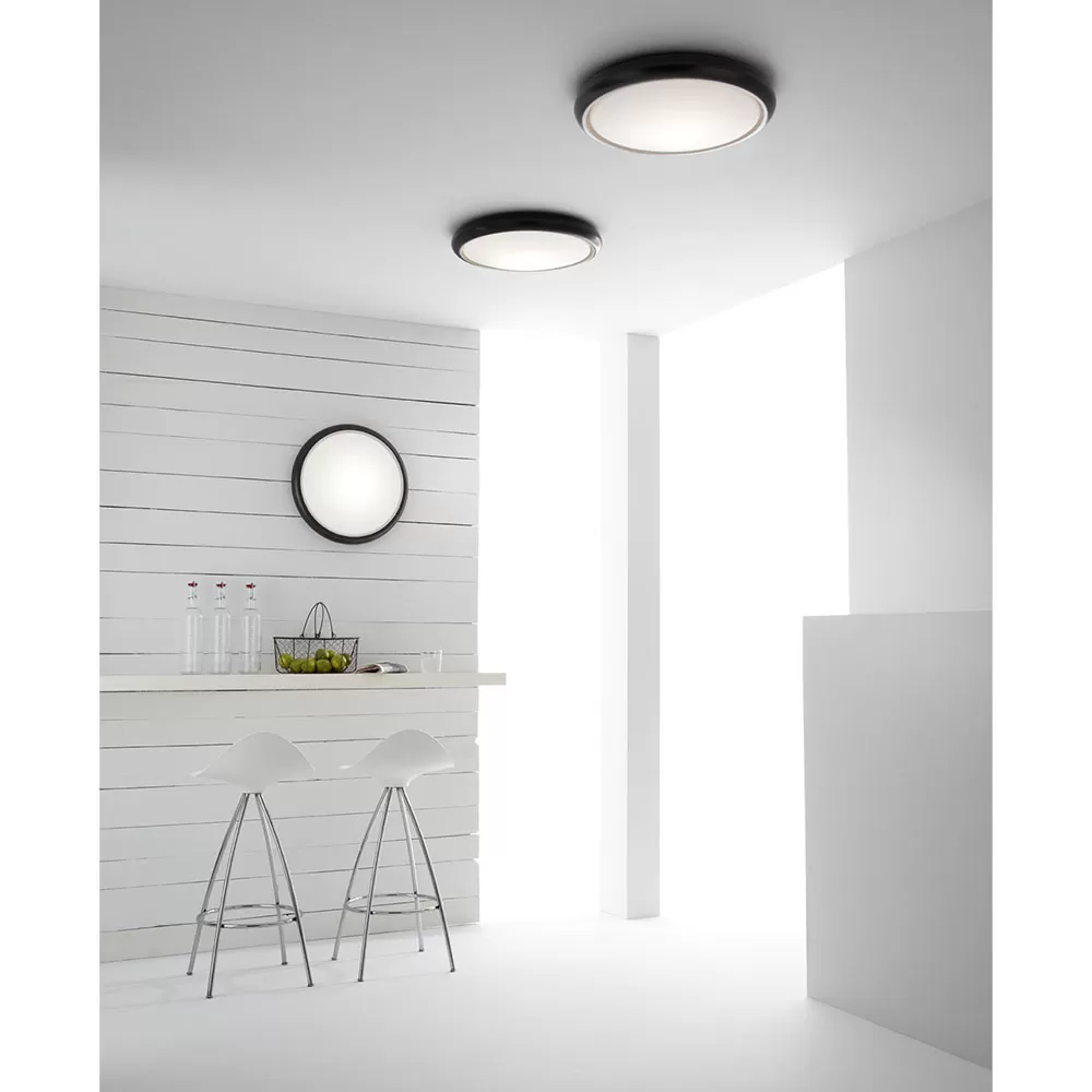 Ceiling or wall lamp. Produces a direct luminous effect thanks to his opal white glass screen.