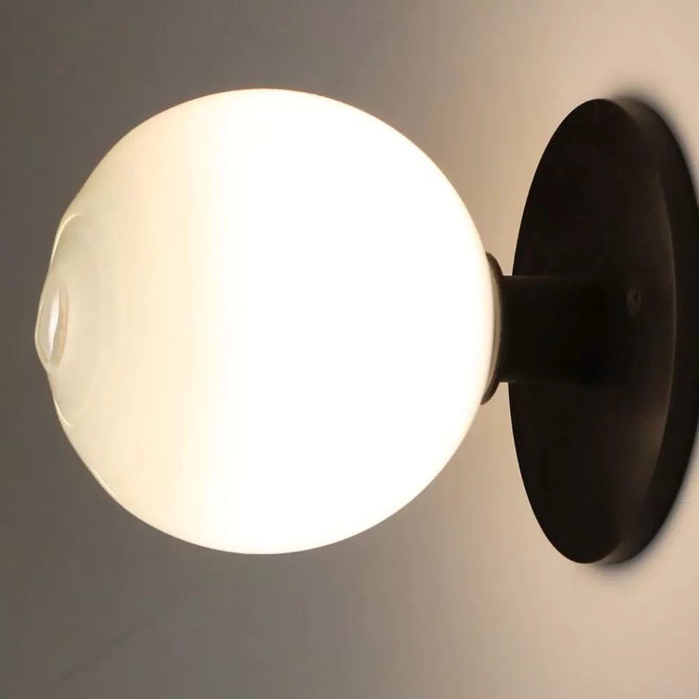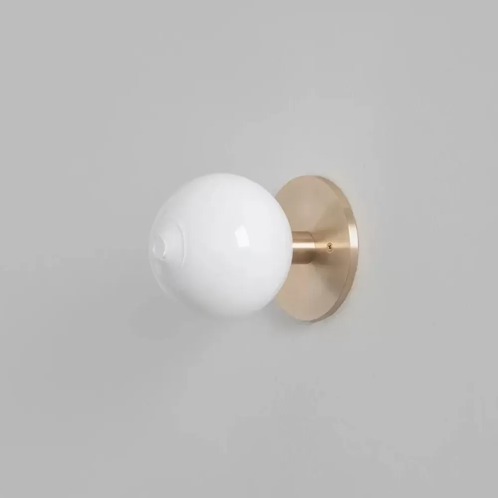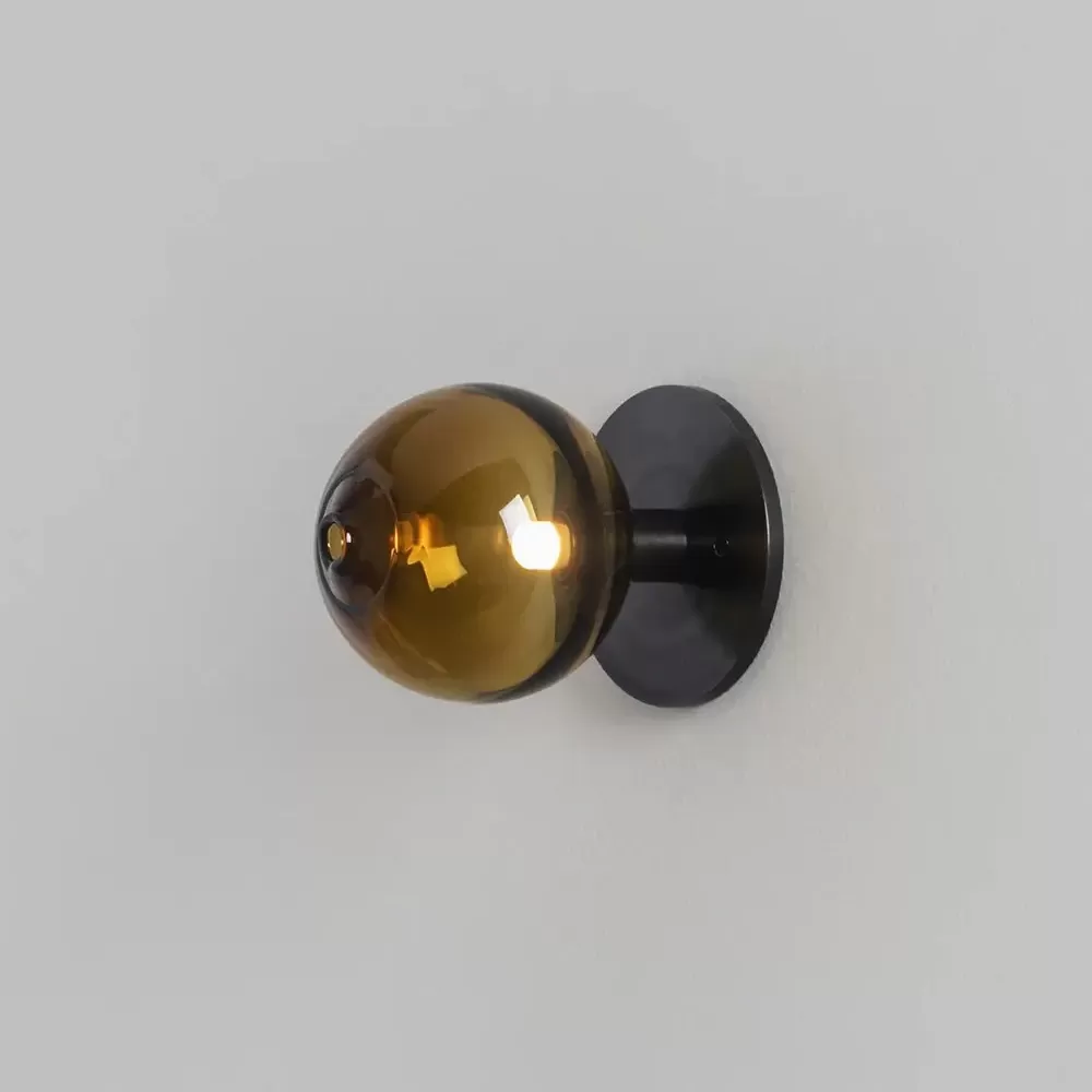 The stem 1x sconce/ceiling light is a minimal light suitable for use as a ceiling light or as a wall sconce. It consists of a single, 4 1/2″ (11cm) diameter sphere of handblown Czech glass, featuring the signature SkLO double-dipped, fire‑polished mouth which shows where the glass is broken from the blower’s pipe, making each unique.