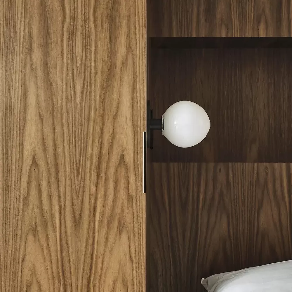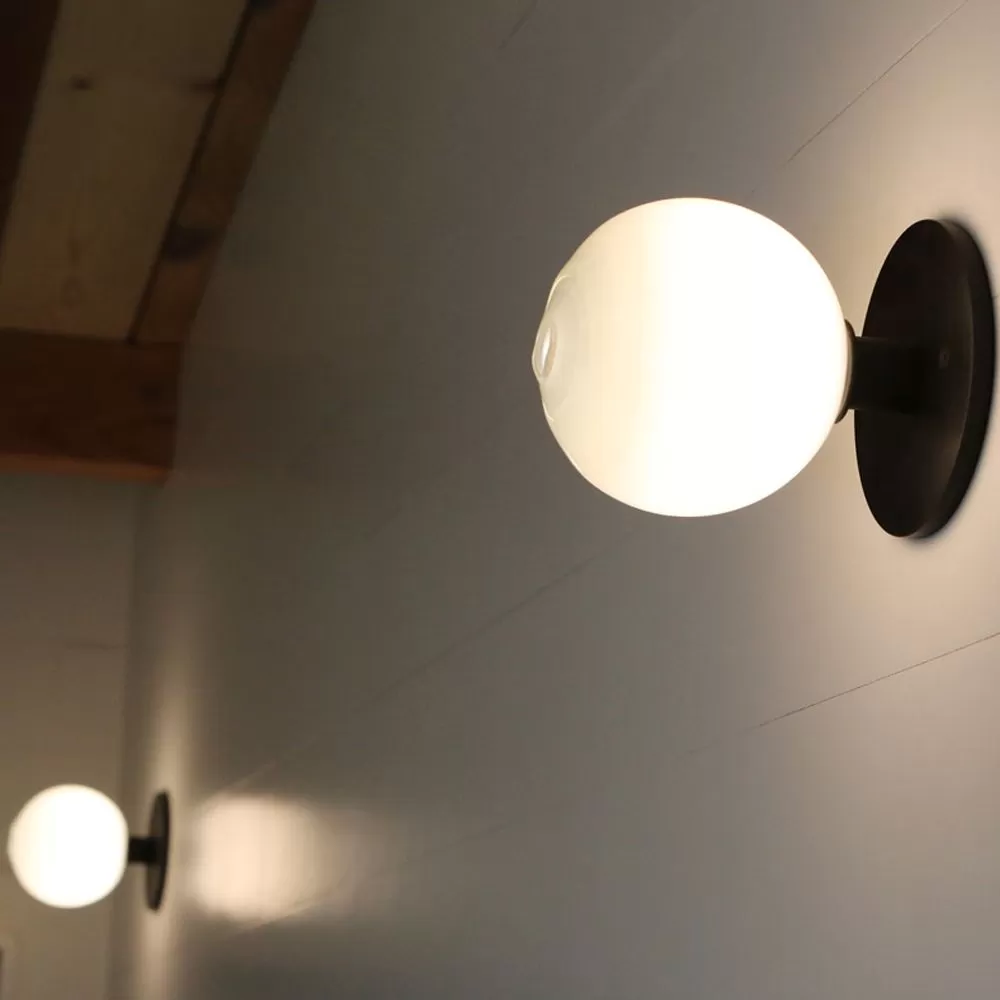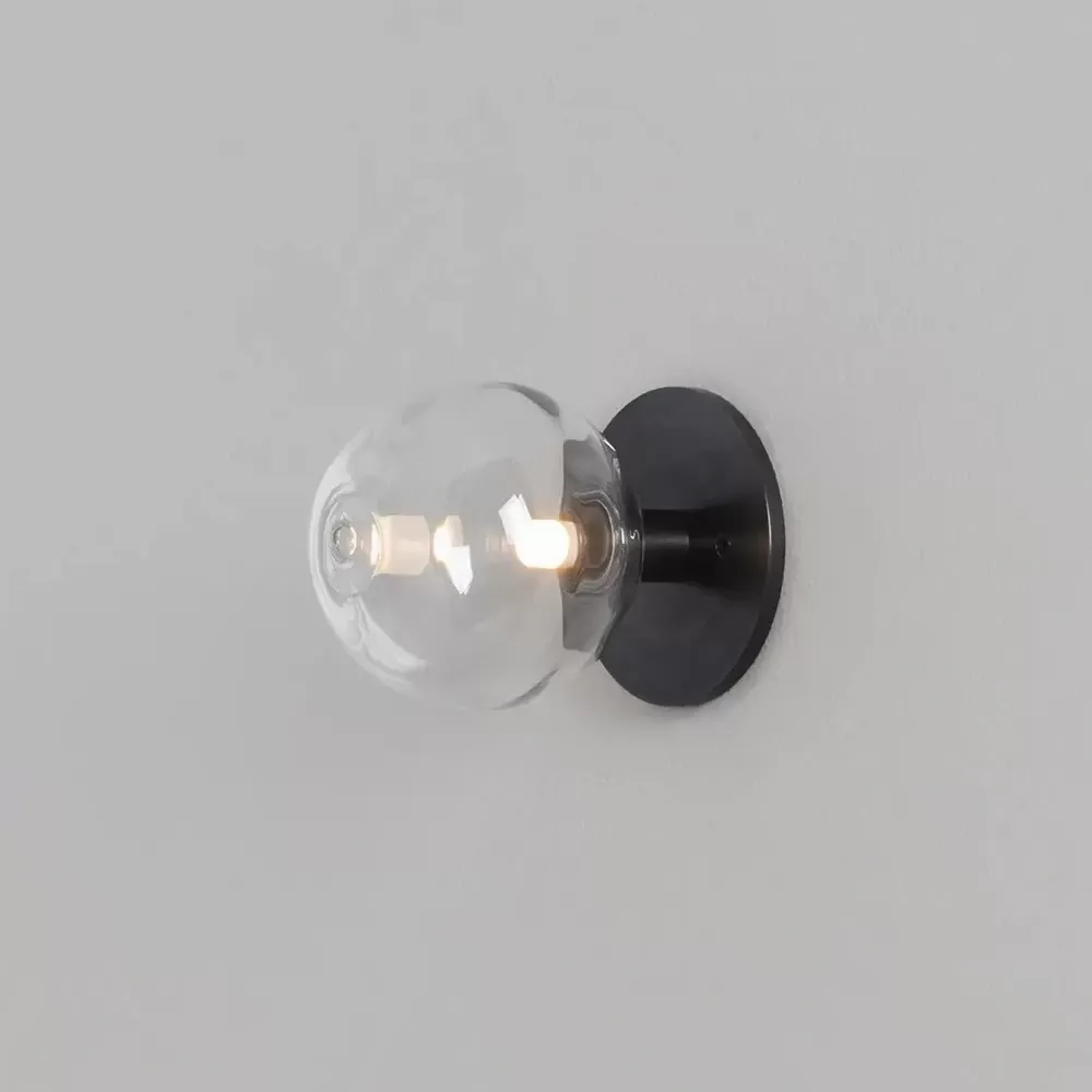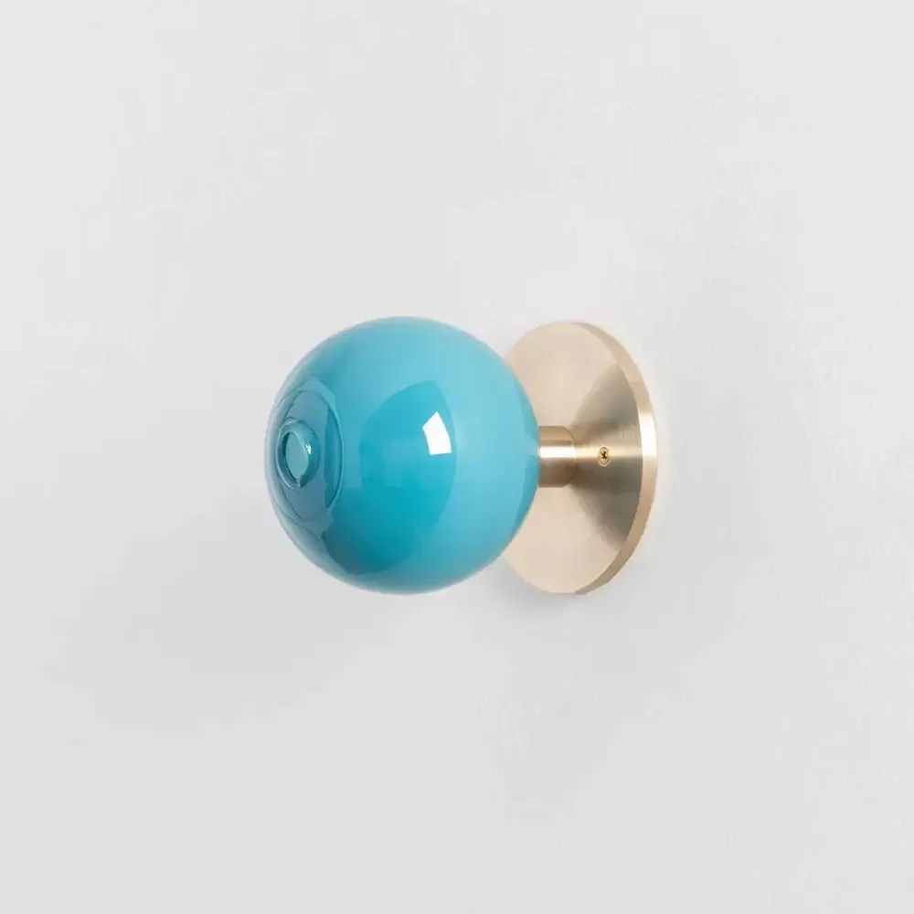 The stem 1x sconce/ceiling light is a minimal light suitable for use as a ceiling light or as a wall sconce. It consists of a single, 4 1/2″ (11cm) diameter sphere of handblown Czech glass, featuring the signature SkLO double-dipped, fire‑polished mouth which shows where the glass is broken from the blower’s pipe, making each unique.