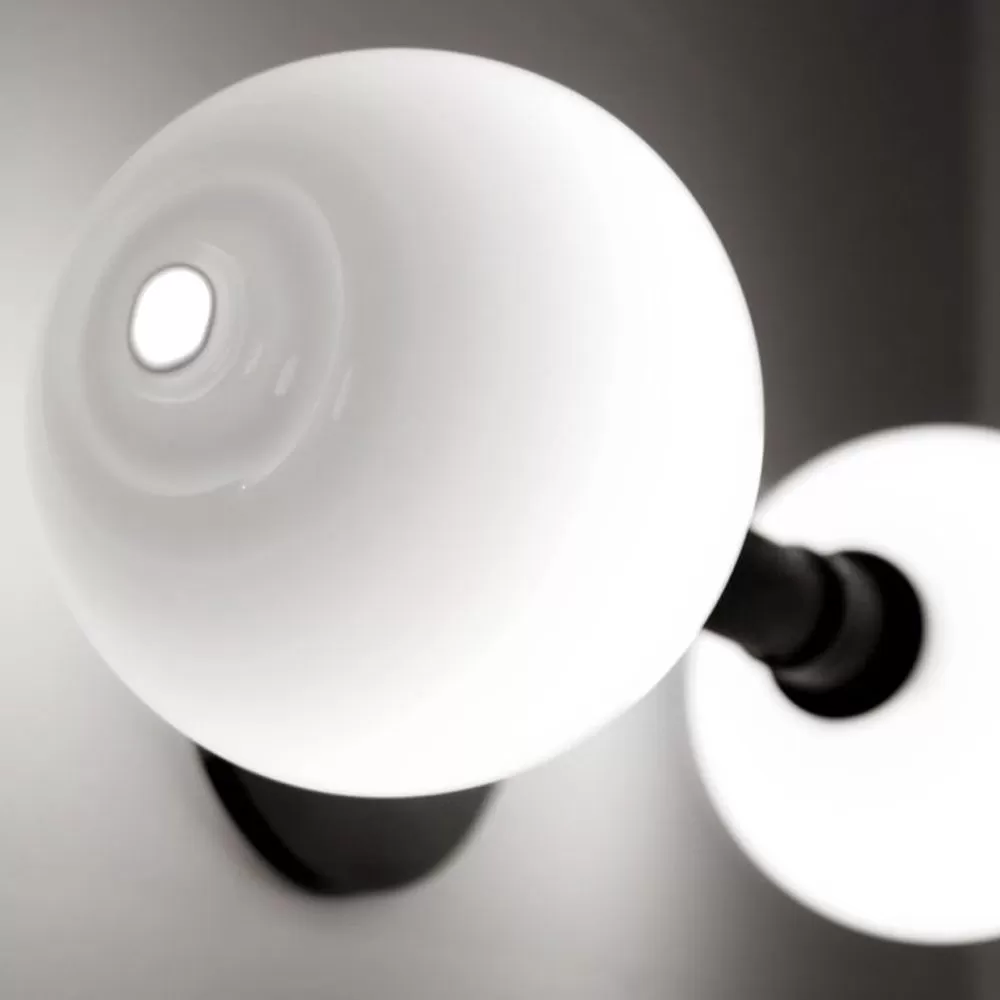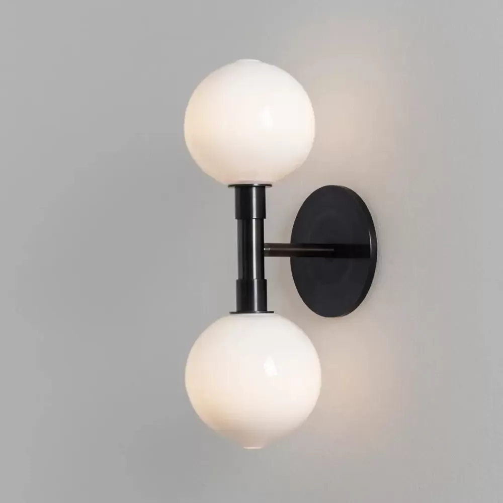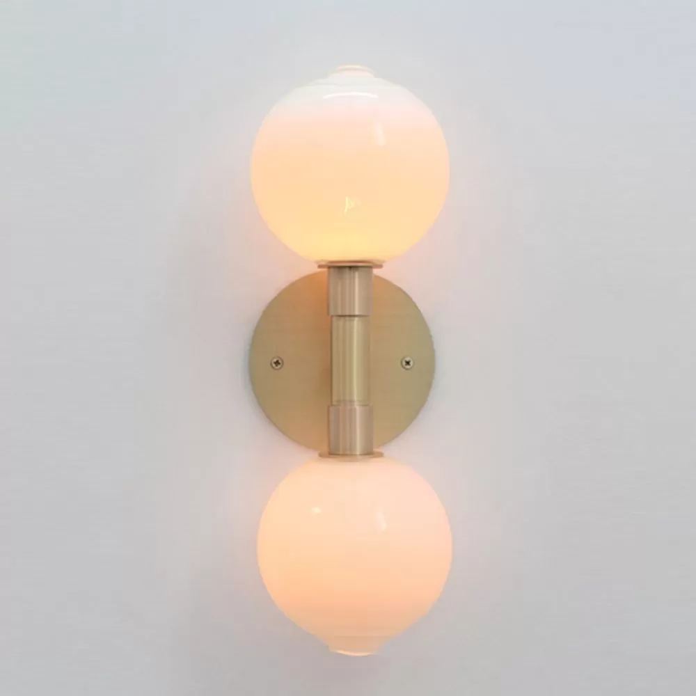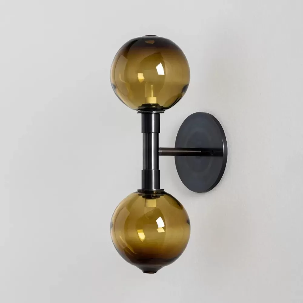 The stem 2x sconce/ceiling light is a minimal light consisting of a pair of 4 1/2″ (11cm) diamater lit spheres of handblown Czech glass on a simple brass armature. The light suitable for use as a ceiling light or as a wall sconce. The glass features the signature SkLO double-dipped, fire-polished mouths which show where the glass is broken from the blower’s pipe, making each one unique.
