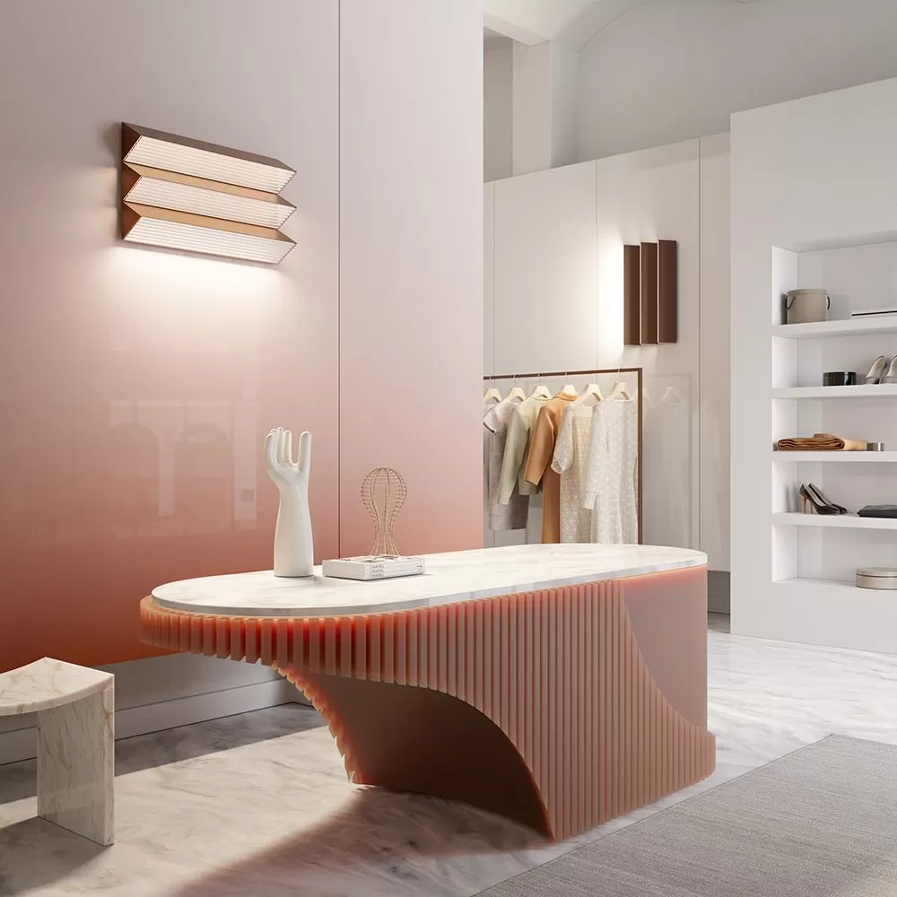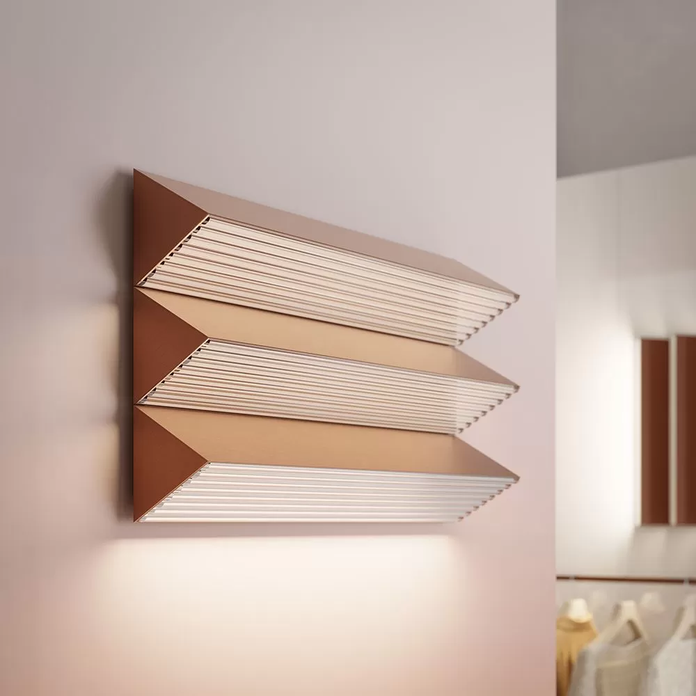 Precious simplicity. Triangular elements with pure, essential lines, which emanate an atmospheric light while being functional. Light takes the leading role, thanks to the ribbed diffuser, chosen specifically to produce unique plays of illumination in various contexts.