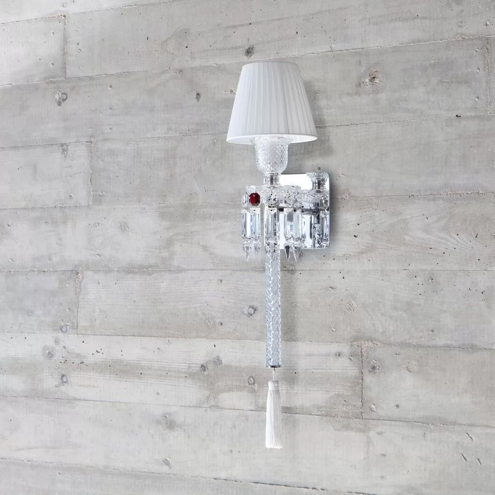 Handmade twisted crystal straight arm, hurricane holder and drip saucer decorated with clear crystal pendants and arrowed prisms as well as one red crystal pendant. Nickel-plated brass bracket with a polished mirror finish. White pleated taffeta lampshade. Black, white or red decorative tassels to place as you wish.