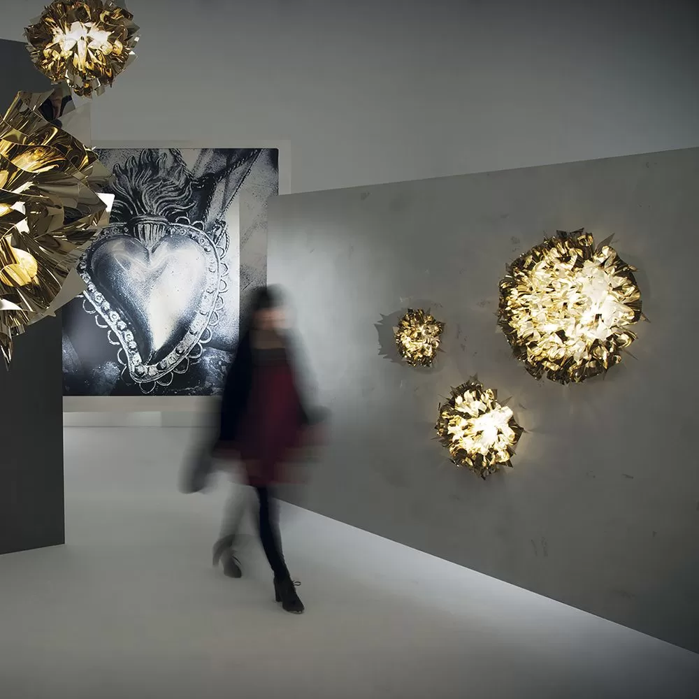 Quality and luster are the values ??that the Veli Gold, Silver and Copper collections add to any interior thanks to Goldflex, Steelflex and Copperflex, the metallic techno polymers patented by Slamp. Drawing inspiration from the softness of the fabrics and materials, the designer Adriano Rachele transposed the concept on the collection (3 ceiling/wall lights and 2 suspensions ” all with magnetic attachment) by designing a interlocked mounting system that is carried out by hand and without visible seams. The result is a glamorous, sophisticated and exclusive collection that is transformed from light source to decorative element, ensuring brightness and noble reflections for residences and large spaces.