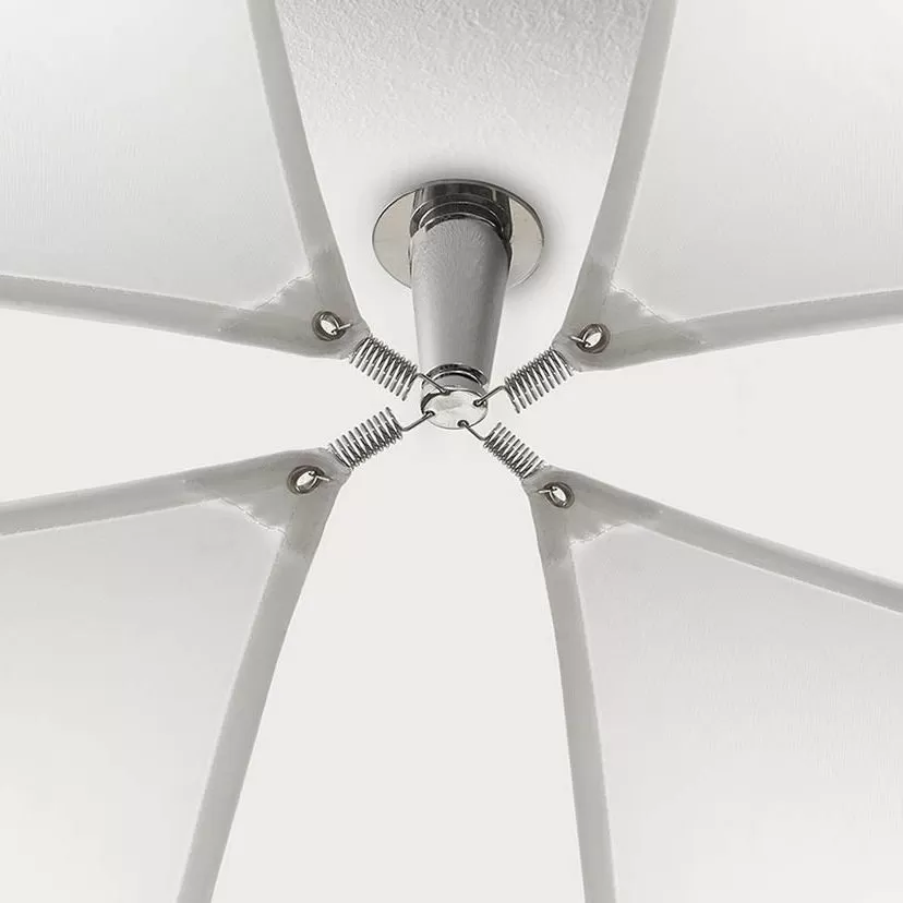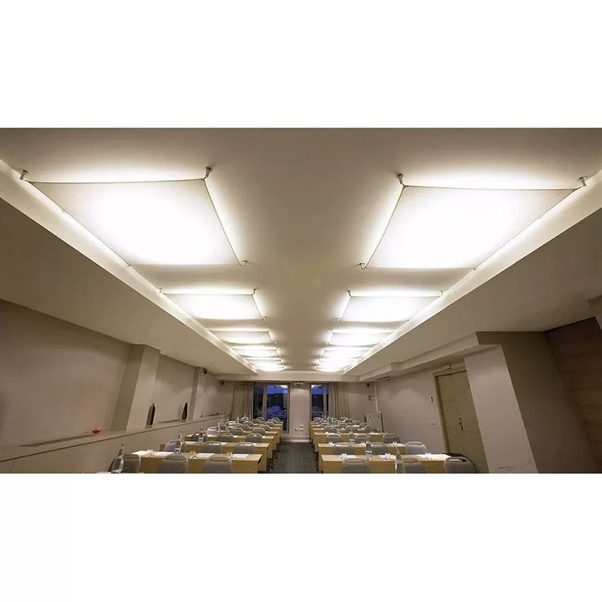 Veroca is a ceiling lamp ideal for lighting large spaces with soft, diffuse light. Veroca features a non-flammable textile diffuser, a lit-up body, and four tension springs with their respective supports. The textile diffuser can be machine washed and ironed without losing its features. Combine two or more textile diffusers along a ceiling to create a unique arrangement throughout a space. The textile diffuser is available in white or natural white. Veroca comes in four sizes, all available with an energy saving dimmable LED light source. Its modular concept, neutral design, and light quality (absolute absence of glare) make Veroca a suitable lamp for residential projects, hotels, or workplaces. It is remarkable for both its simplicity and easy adaptation to the environment. The design of its packaging allows this collection of large lamps to take the minimum possible space for proper delivery.