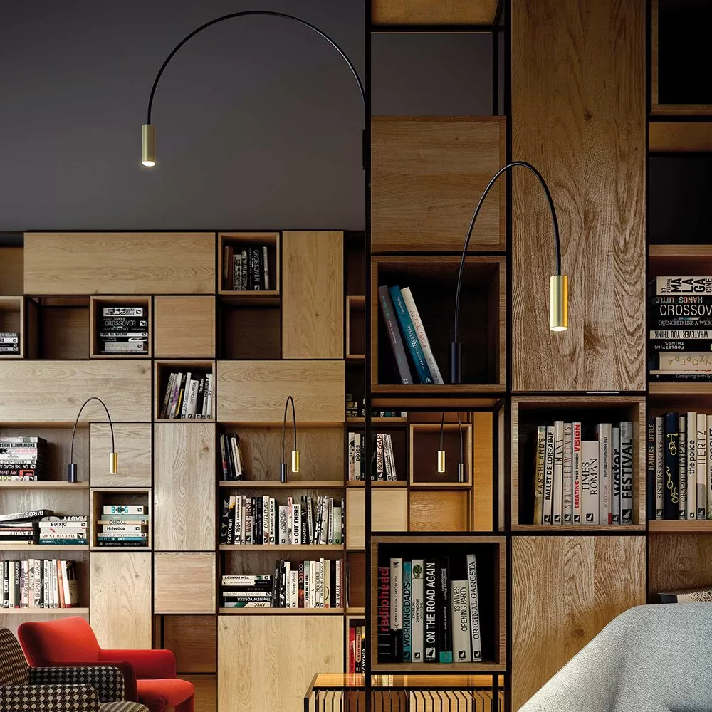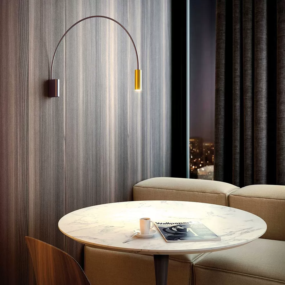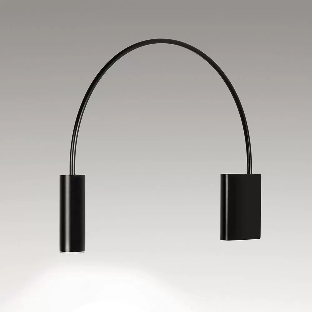 Metallic wall lamp with a curved arm, cylindrical aluminium head and (PMMA) lens diffuser. 50 degree angle acrylic optic lens conversion kit is optional.