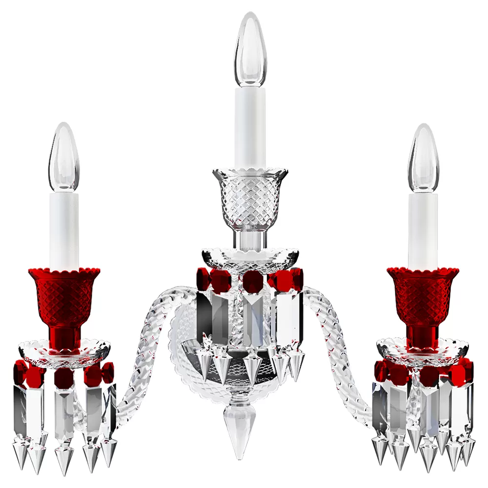 This wall unit, whose architecture is strictly identical to the clear Zenith one, is revealed under a new light thanks to its suit of golden red crystal, iconic of Baccarat, which magnifies its ornamentations. A clear crystal octagon conversely represents Baccarat’s signature. Several options for staging your wall unit: with or without lampshade or hurricane shade.